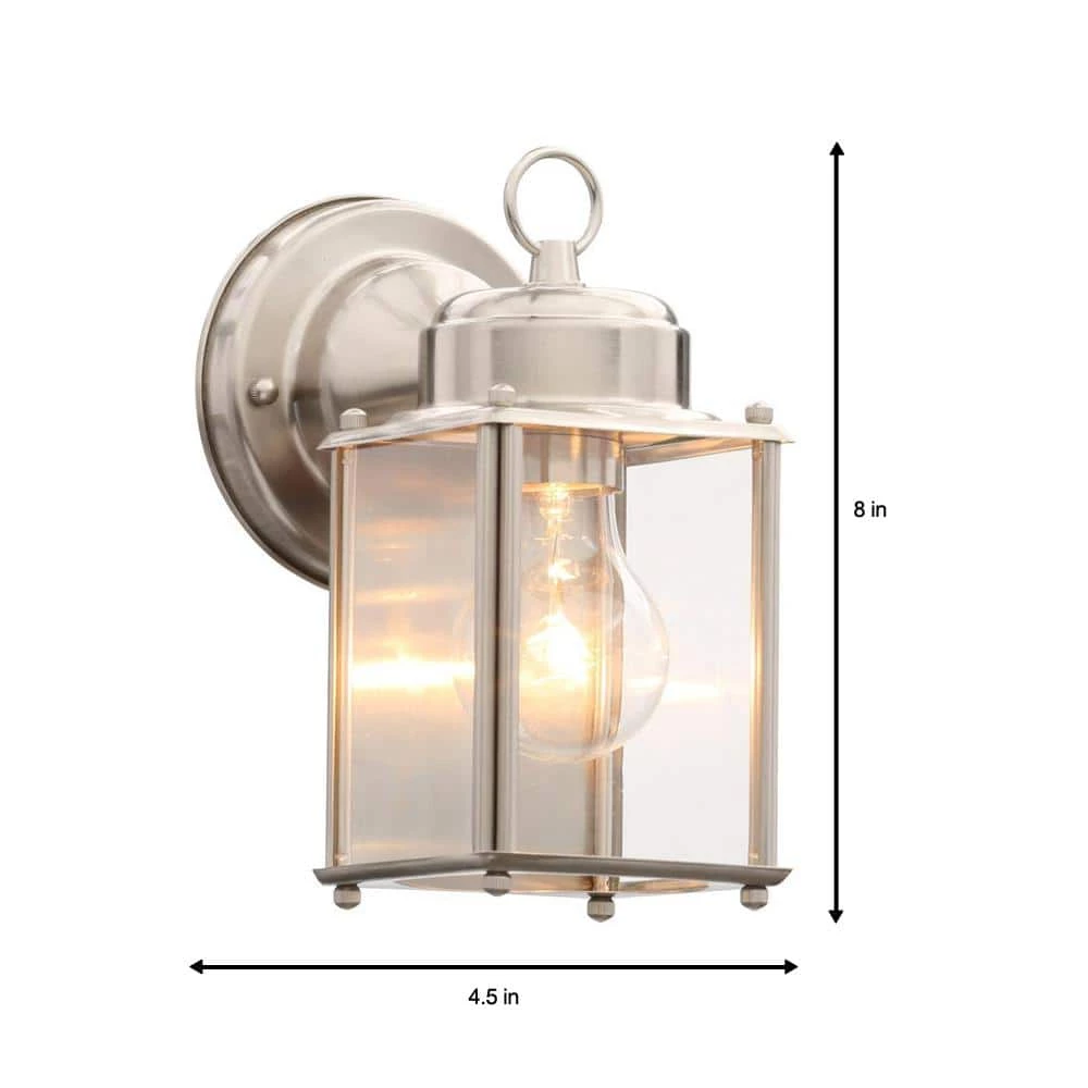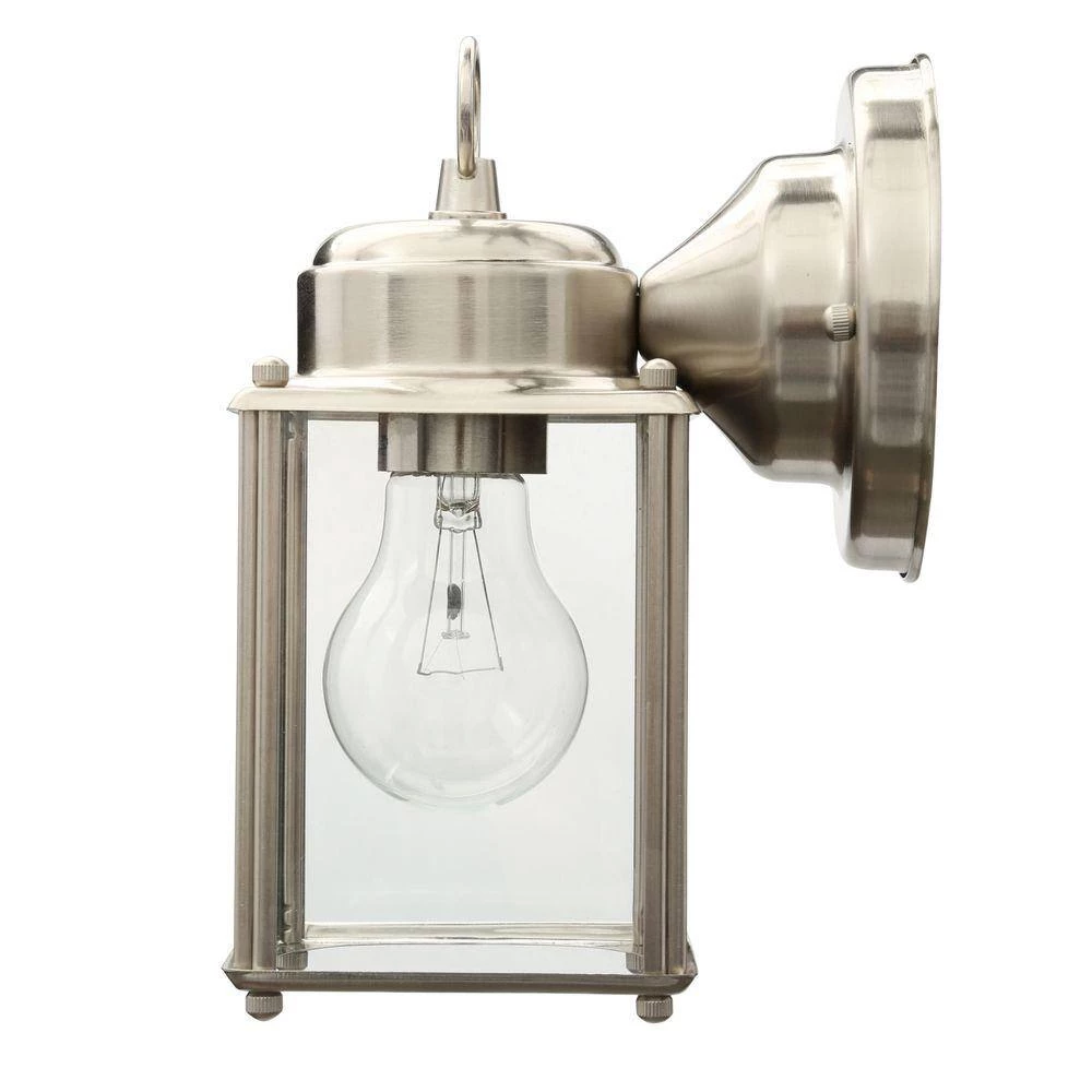 This 1-Light Brushed Nickel Outdoor Wall Lantern from Progress Lighting is a carriage-style fixture equipped with clear glass to beautifully enhance household exteriors. The exquisite lamp coordinates with any decor scheme and is a superb choice for porch, garage, facade, column, patio or deck lighting. Fashioned with a durable powder-coated finish to extend its life and allure, this weather-resistant fixture uses one 100-Watt maximum medium-base bulb (sold separately) to keep your outdoor space delightfully illuminated.
