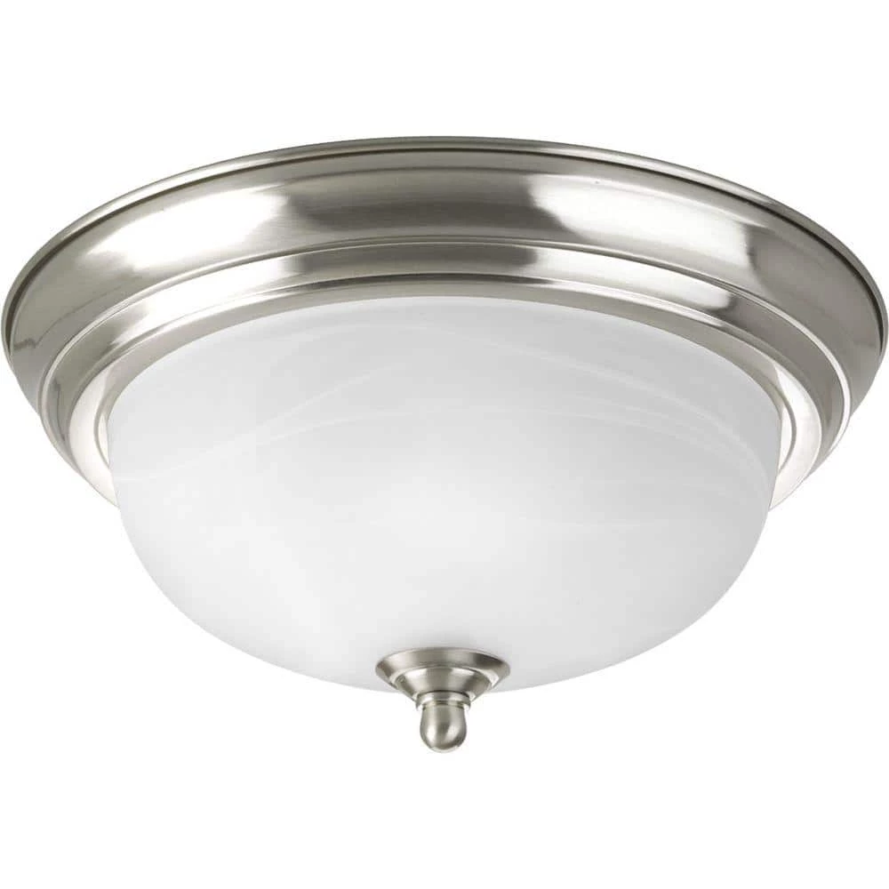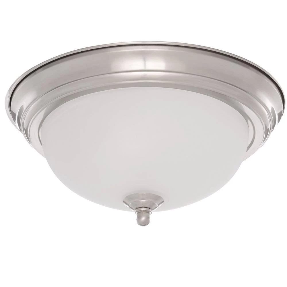 Traditional style ceiling fixture with a domed, etched glass diffuser. Decorative ceiling pan transitions nicely to glass shade which is held in place with a matching metal finial. Safety listed for use in damp locations such as bathrooms.