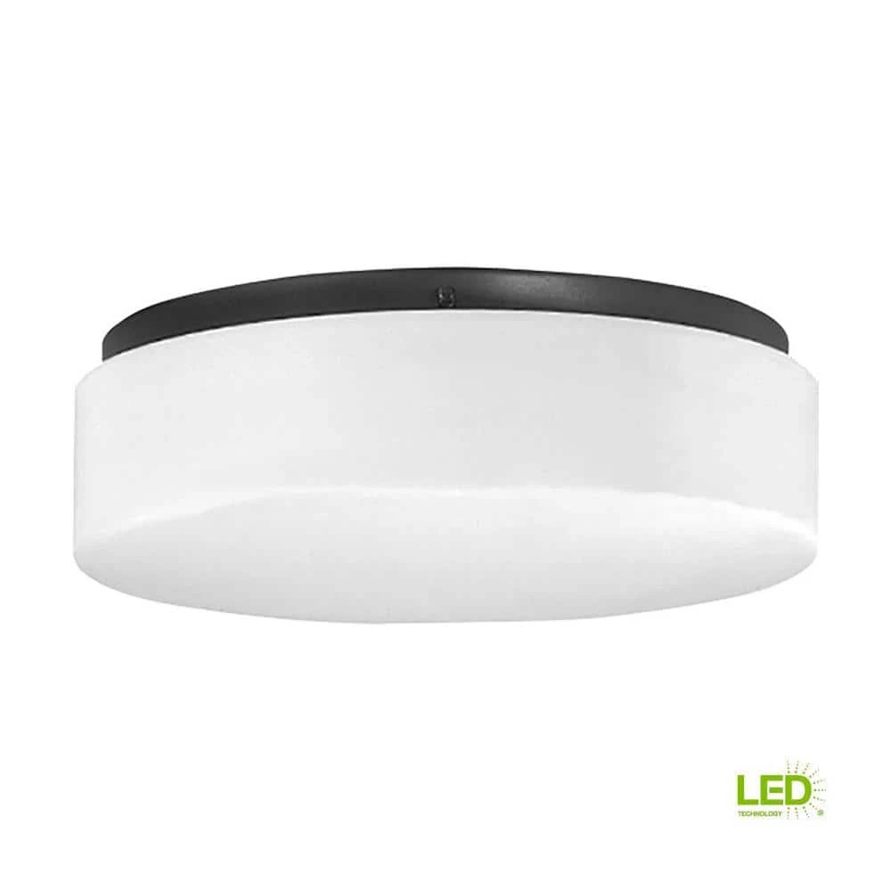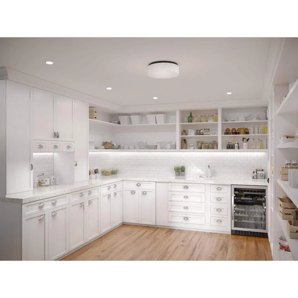 LED flush mount with white acrylic diffuser mounts to baked enamel ceiling pan. Twist on installation with a single locking thumb screw. UL approved for damp locations. Ceiling or wall mount. 1680 lumens, 80 lumens/watt, 3000K and 90CRI. ENERGY STAR and Title 24.