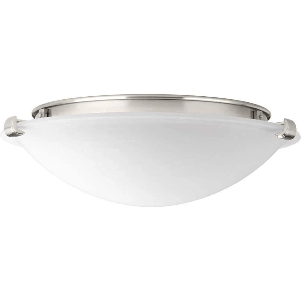 A domed, linen finish glass diffuser is discreetly supported from metal fittings and encloses an energy-efficient light source. Brushed Nickel finish. 1600 source lumens.