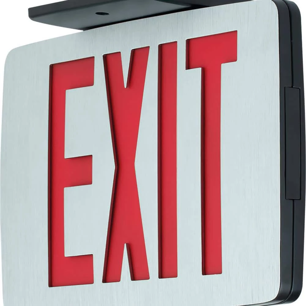 The PEALE Series offers quality and value with a compact and attractive Thin Die-Cast aluminum Exit sign. Exit face illumination by low energy, long-life red ultra bright LED’s. The Exit face-plate is brushed aluminum with black edges and 6 in. letters with a red diffuser. Single-face models can be wall, end or ceiling mounted. Includes canopy, universal mounting plate and a battery for emergency operation. Test switch and AC-on indicator are located at bottom center. Directional indication made by knock-out chevrons.