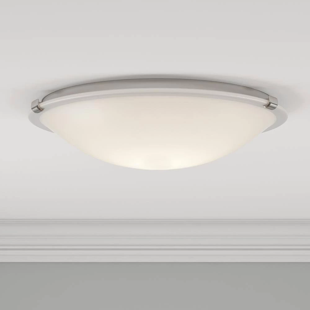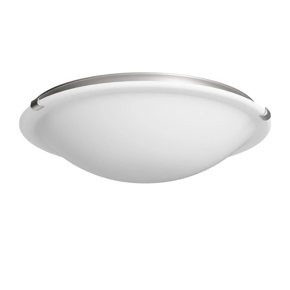 A domed, linen finish glass diffuser is discreetly supported from metal fittings and encloses an energy-efficient light source. Brushed Nickel finish. 2100 source lumens.