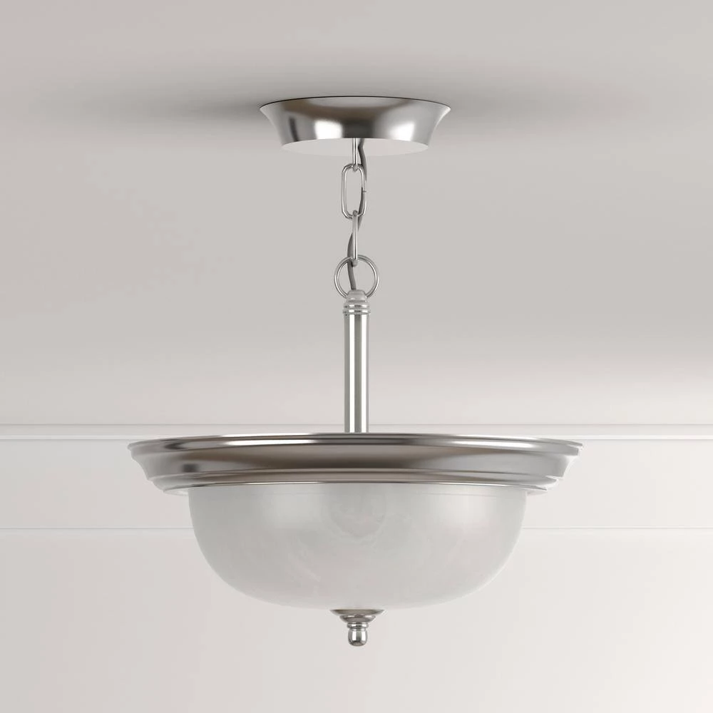 Traditional style ceiling fixture with a domed, etched glass diffuser. Decorative ceiling pan transitions nicely to glass shade which is held in place with a matching metal finial. Safety listed for use in damp locations such as bathrooms. The design delivers great versatility with installation options that include both a pendant and a close-to-ceiling configuration with included hardware.