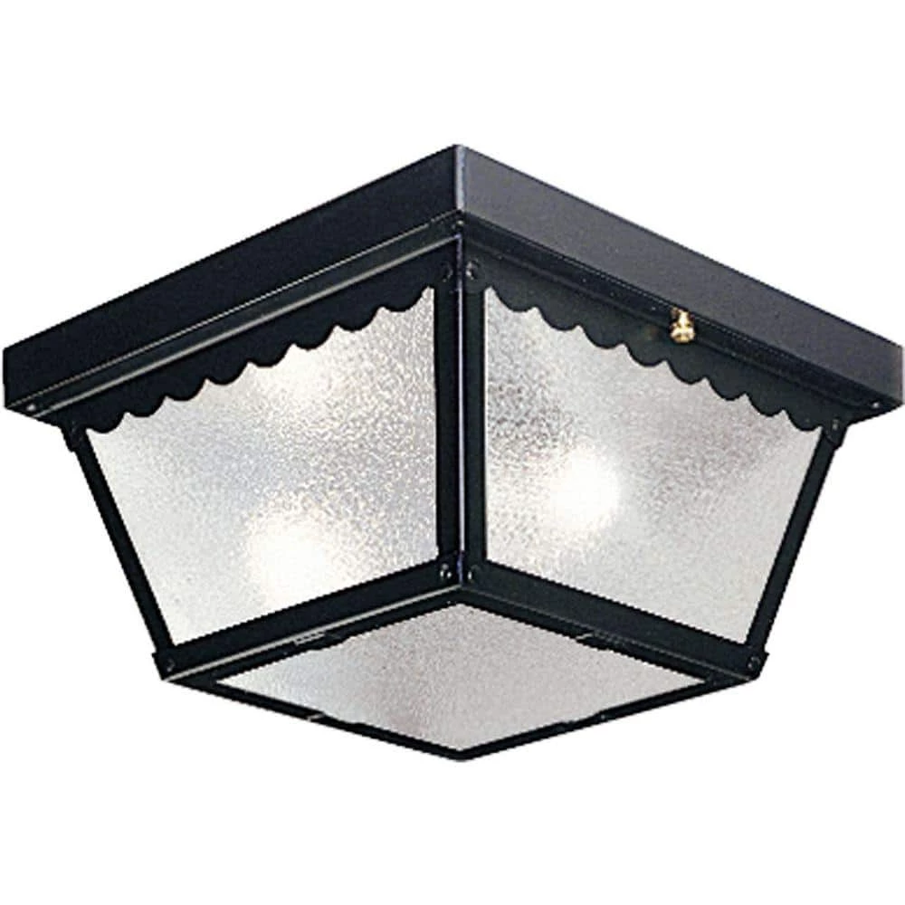 Solid metal light fixture with scalloped edge detail. Textured glass panels for uniform illumination. Designed for installation indoor or outdoors – under a carport or covered porch, for example.