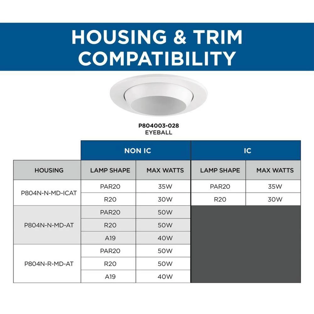 Accent your space and highlight decorative objects with this 4-in. Eyeball Adjustable Recessed Ceiling Light finished in satin white. 360° positioning and 30° tilt allow for precise, variable directional downlight adjustment for wall washing, task lighting or highlighting objects. Integral steel flange design means light leaks are eliminated around the flange and irregular ceiling openings are covered. Easy push-in leaf spring installation forces trim to fit snugly against the ceiling minimizing air leak. UL and CUL damp-rated.