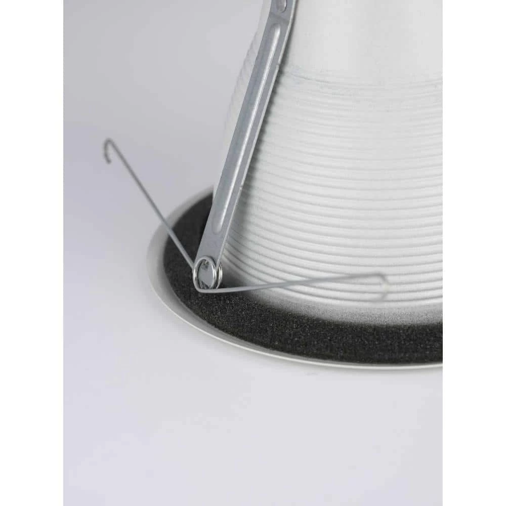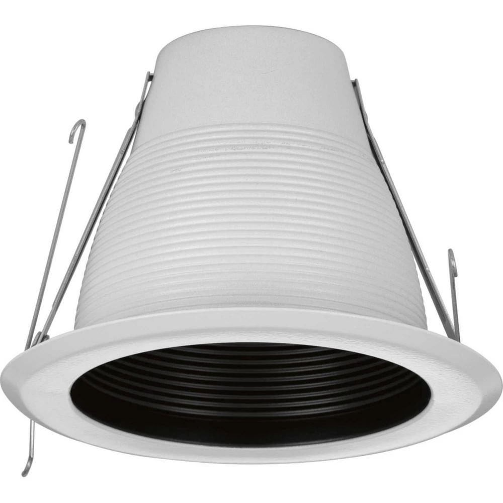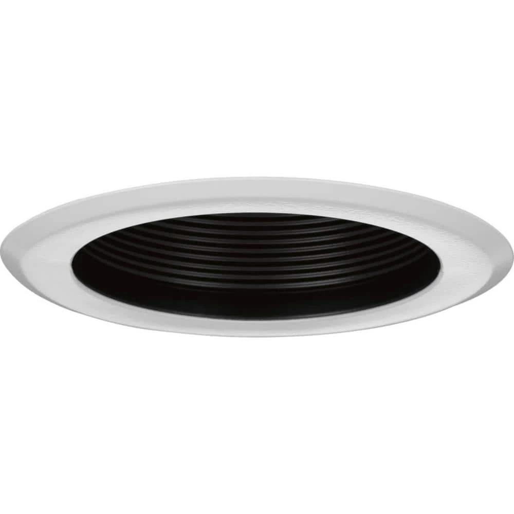 5 in. Step Baffle Trim in a Black finish and bright white powdered painted metal flange. UL and cUL Listed for damp locations. The trim uses friction springs to attach to the housing to provide a flush fit against the ceiling. Compatible for use in Progress (P851/P1841) and other housings.