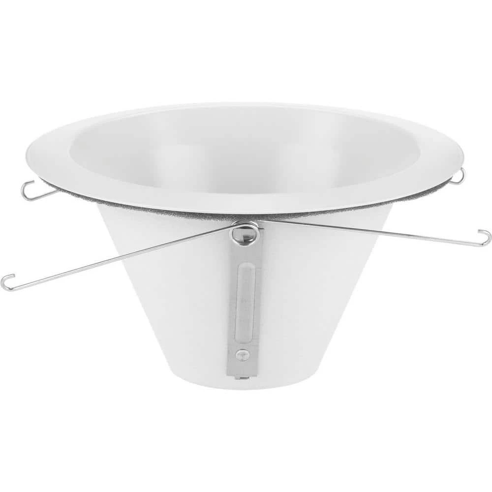 The 6 in. Open Trim finished in satin white is designed for use in shallow ceilings paired with a shallow height recessed housing. The single-piece aluminum construction eliminates light leaks around the flange and allows it to cover irregular ceiling openings. The smooth surface of the reflector offers a classic look and maximizes lamp output, producing more light. The socket mounts to the trim for optimum performance and consistent lamp position. The integrated torsion springs force trim to fit snugly against the ceiling, providing a secure trim installation and minimizing air leak. UL-CUL damp location rating makes this trim ideal for use in a variety of room settings in conjunction with 6 in. new construction or remodel recessed housing.