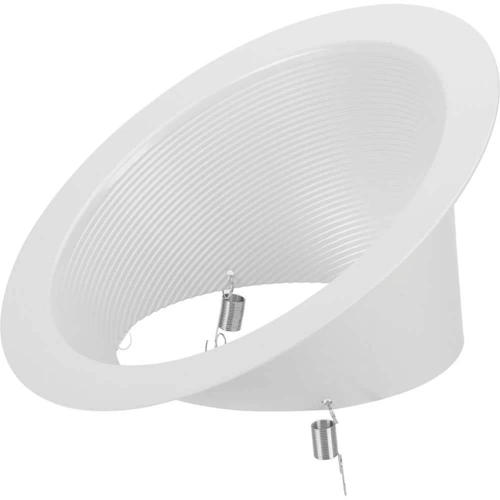 The 6 in. Step Baffle Trim finished in satin white is designed for use in sloped ceilings paired with a sloped ceiling recessed housing, the single-piece aluminum construction eliminates light leaks around the flange and allows it to cover irregular ceiling openings, the surface baffles on the reflector offer a classic look and break-up the lamp reflection producing a more comfortable light, the integrated coil springs force trim to fit snugly against the ceiling, providing a secure trim installation and minimizing air leak. UL-CUL damp location rating makes this trim ideal for use in a variety of room settings in conjunction with 6 in. sloped ceiling new construction or remodel recessed housing.
