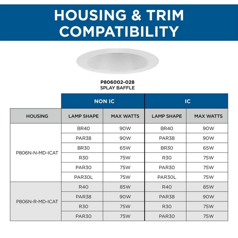 The 6 in. Splay Baffle Trim finished in Satin White offers 1 of the most popular recessed downlighting solutions. The single-piece aluminum construction eliminates light leaks around the flange. A wider trim flange allows for coverage of more irregular and larger ceiling openings. The surface baffles on the reflector offer a classic look and break-up the lamp reflection producing a more comfortable light. The socket mounts to the trim for optimum performance and consistent lamp position. The integrated torsion springs force trim to fit snugly against the ceiling, providing a secure trim installation and minimizing air leak. UL-CUL damp location rating makes this trim ideal for use in a variety of room settings in conjunction with 6 in. new construction or remodel recessed housing.