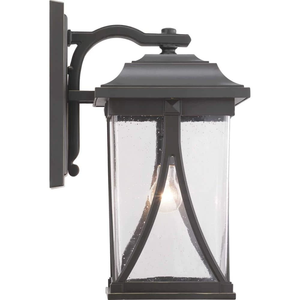 Distinctive forms with ancient roots are featured in this large wall lantern from the Abbott Collection. Transparency, depth and dimension are all on display to highlight the clear seeded glass and sweeping details within the Antique Bronze frame. Classic lines and sweeping details of the lantern design make it ideal for Traditional settings.