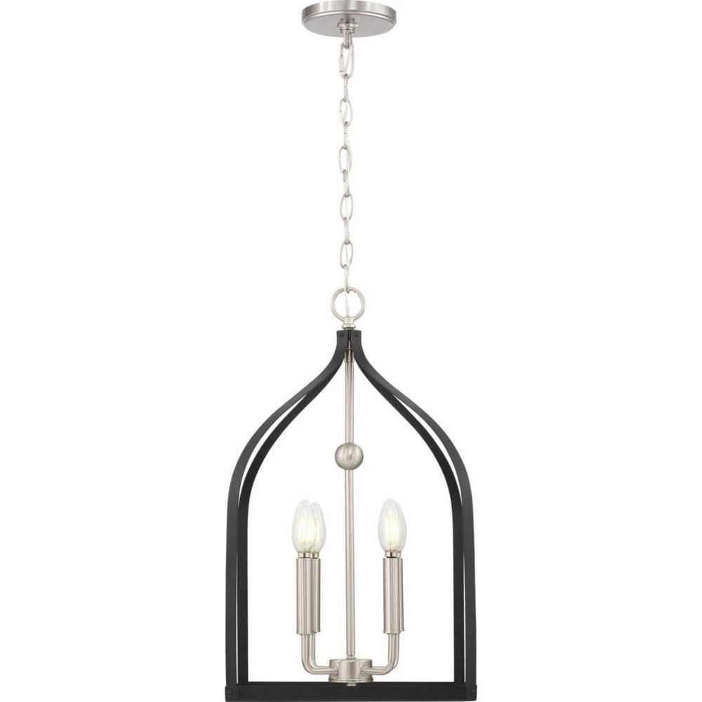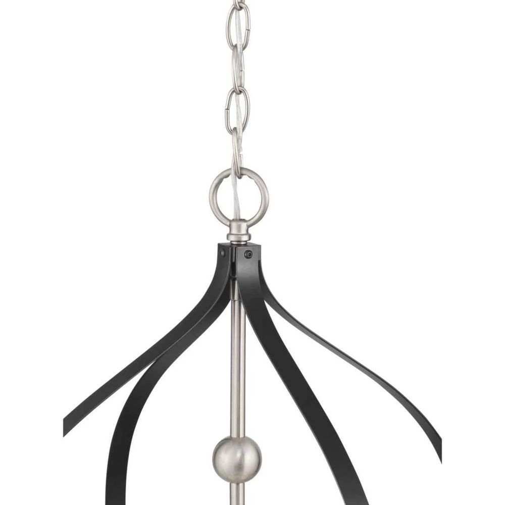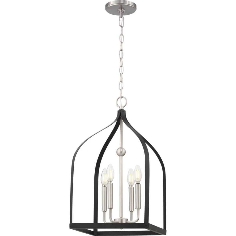 Fall in love with the rustic Abner Mill 4-Light Chandelier. The open, airy frame is coated in a brushed nickel finish with matte black accents for a modern farmhouse design. 4 light bases gather around the center column underneath long, curved arms that reach up from the base of the frame.