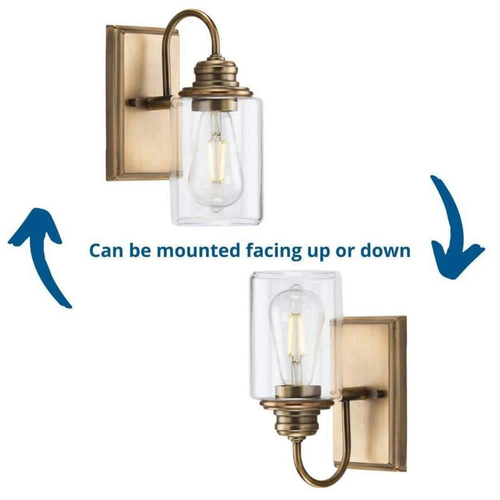 Enjoy delightful charming details with the Aiken Collection 1-Light Vintage Brass Clear Glass Vintage Bath Vanity Light. The beveled backplate, elegantly curved arm and vintage light base are coated in a golden vintage brass finish. A light source glows from inside a clear glass shade reminiscent of vintage apothecary bottles. for ideal illumination, use 1 medium base bulb that is sold separately (60-Watt maximum – LED/CFL/incandescent). The wall light is compatible with dimmable bulbs. The bath light’s charming design is ideal for any entryway, hallway, foyer, bedroom, sitting room, living room or bathroom in farmhouse, coastal and vintage electric style settings. It’s time to breathe new life into the mundane every day with timeless and truly transformative lighting. Make your purchase today to begin your journey to a whole new lighting experience. Progress Lighting products are designed for exceptional quality, reliability and functionality.