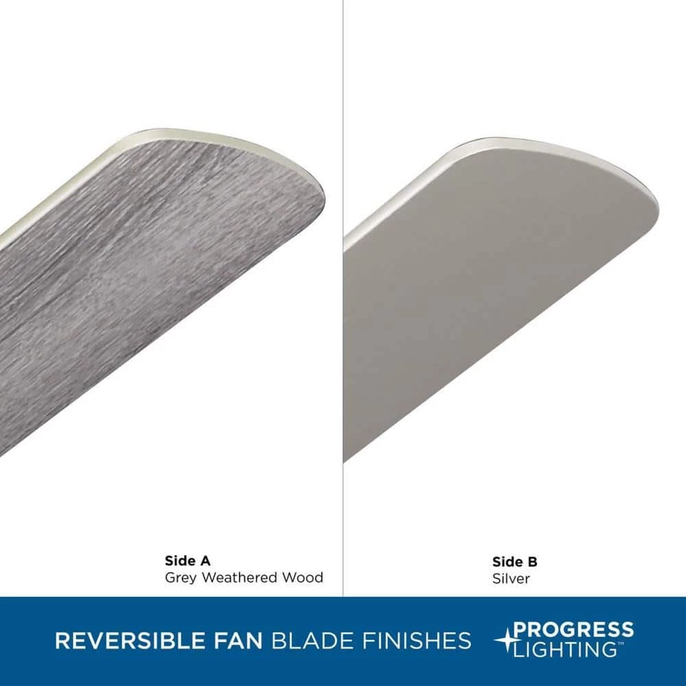 - 5 sleek reversible fan blades finished in smooth silver or grey weathered wood extend from a clean, modern housing