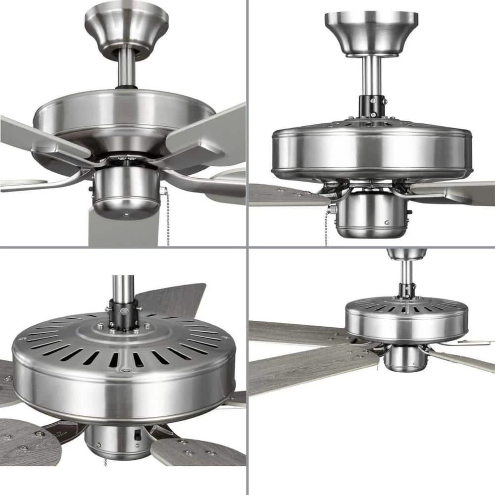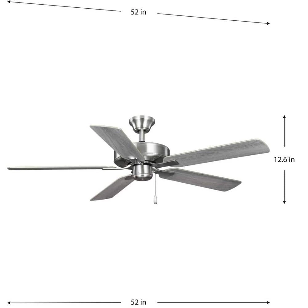 The AirPro 52 in. 5-blade ceiling fan refreshes interiors with a sleek, modern form coated in smooth Brushed Nickel finish 5 clean-lined fan blades extend outward from a streamlined motor housing that contains a powerful AC motor. Its versatile yet timeless design makes it ideal for a wide range of interior decor styles. The fan has an AC motor and is rated for maximum efficiency. The fan accepts a universal light kit and an accessory wall and remote control (all sold separately). The fan can be installed on a flat or sloped ceiling. The blade arms have Captive Screws allowing for easier installation.