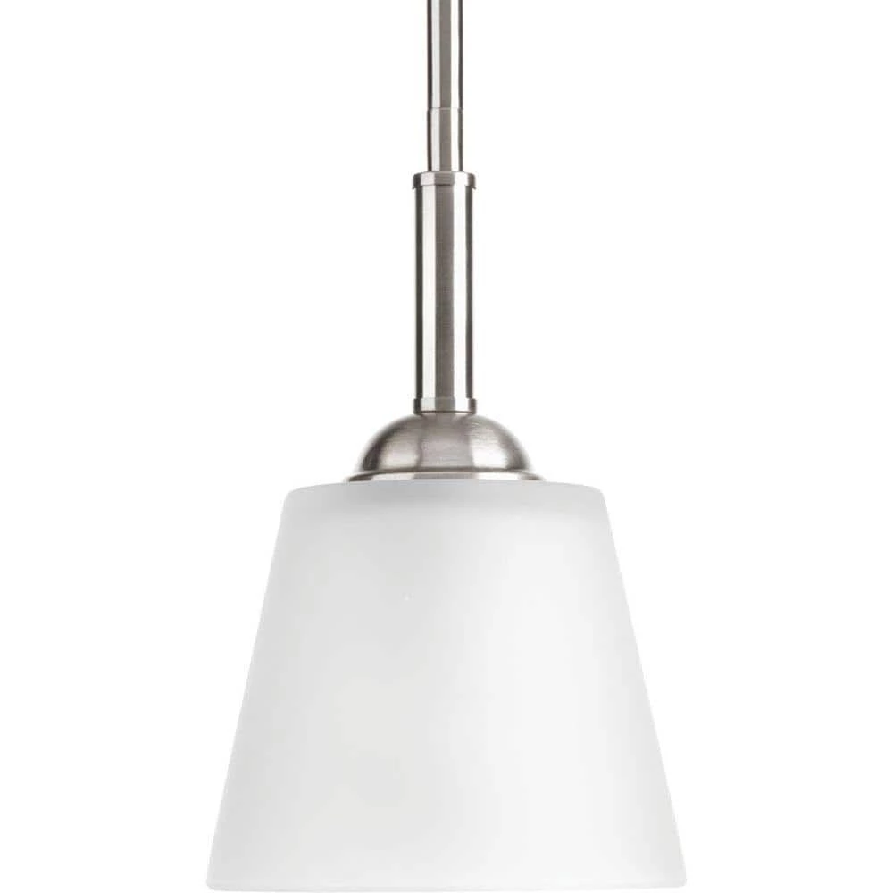 The 1-light mini-pendant from the Arden collection offers a comfortable silhouette that is both rustic and modern. A substantial arm suspends etched glass. This mini-pendant coordinates well with other Progress Lighting series, such as Cherish.