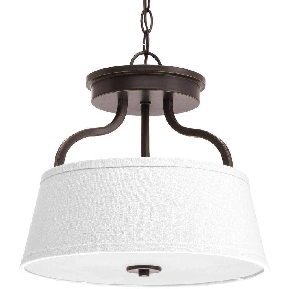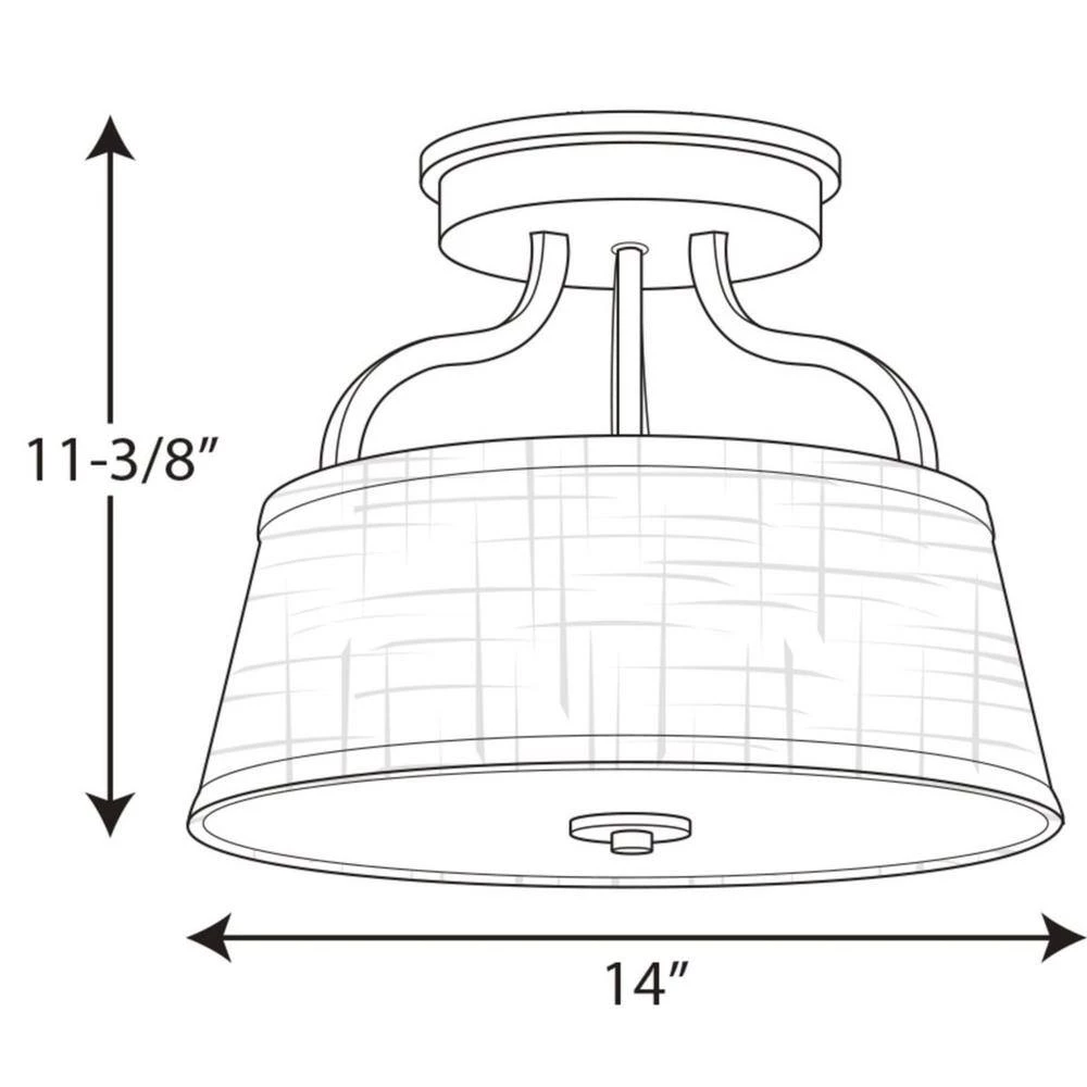 The 2-light semi-flush convertible fixture from the Arden collection offers a comfortable silhouette that is both rustic and modern. A substantial frame is crafted from over scale tubing to heighten the effect. The summer linen shades with etched glass diffuser coordinates with many other Progress Lighting styles like Cherish.