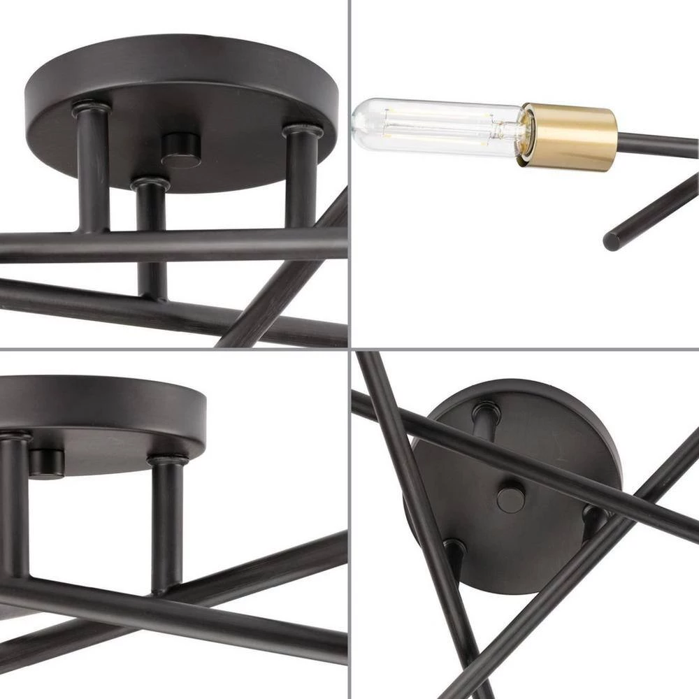 The Astra semi-flush mount light features a space-age-inspired design perfect for modern and mid-century décor. A trio of spoked arms radiate out from a cylindrical down rod suspended from a center round canopy, bringing a dynamic flair to the fixture’s design. An antique bronze finish adds a touch of warmth. Decorative bulbs (sold separately) adorn the ends of each perpendicular arm. The generous scale is ideal for bringing illumination to bedrooms, hallways and family rooms. This fixture is part of the Progress Lighting Design Series, a lighting collection offering fashionable styles and affordable luxury lighting for the home.