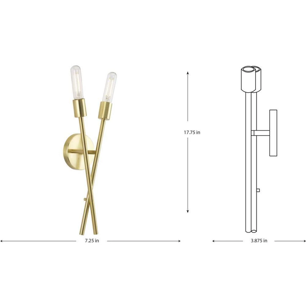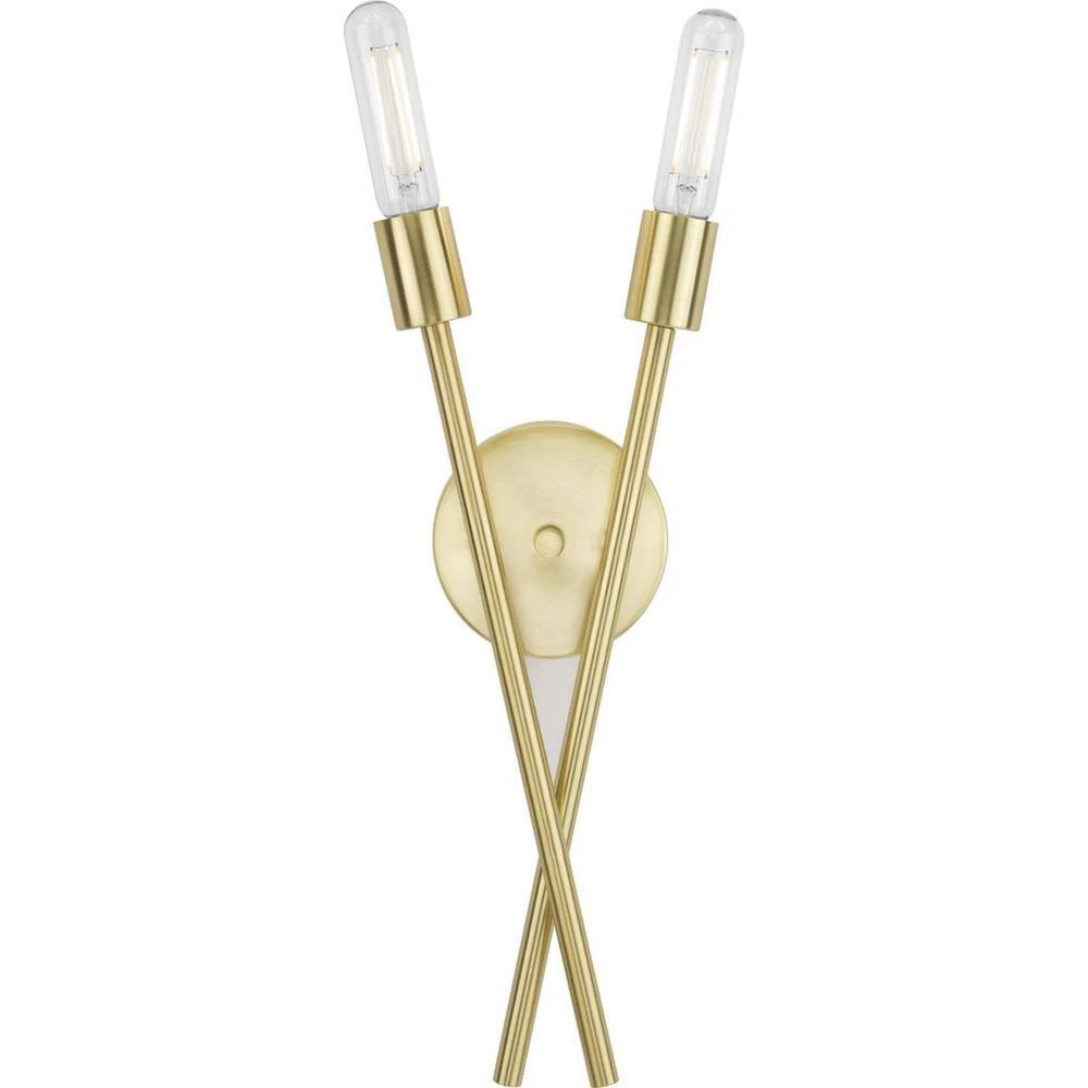 The Astra wall bracket features a space-age-inspired design perfect for modern and mid-century décor. A pair of elongated arms are held by a round backplate, bringing a dynamic flair to the fixture’s design. A lovely satin brass finish adds a touch of soft glamour. Decorative bulbs (sold separately) adorn the ends of each perpendicular arm. This versatile wall bracket is ideal for bringing illumination to dining rooms, kitchens and bedrooms. This fixture is part of the Progress Lighting Design Series, a lighting collection offering fashionable styles and affordable luxury lighting for the home.