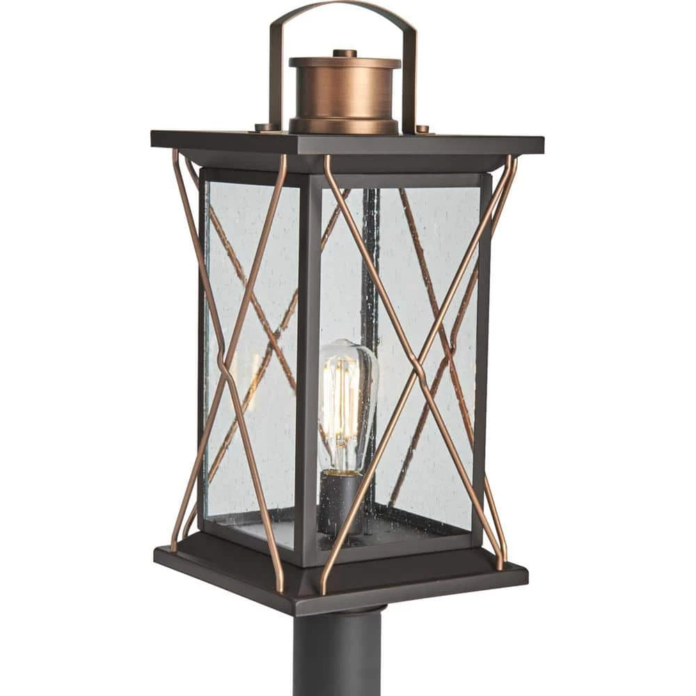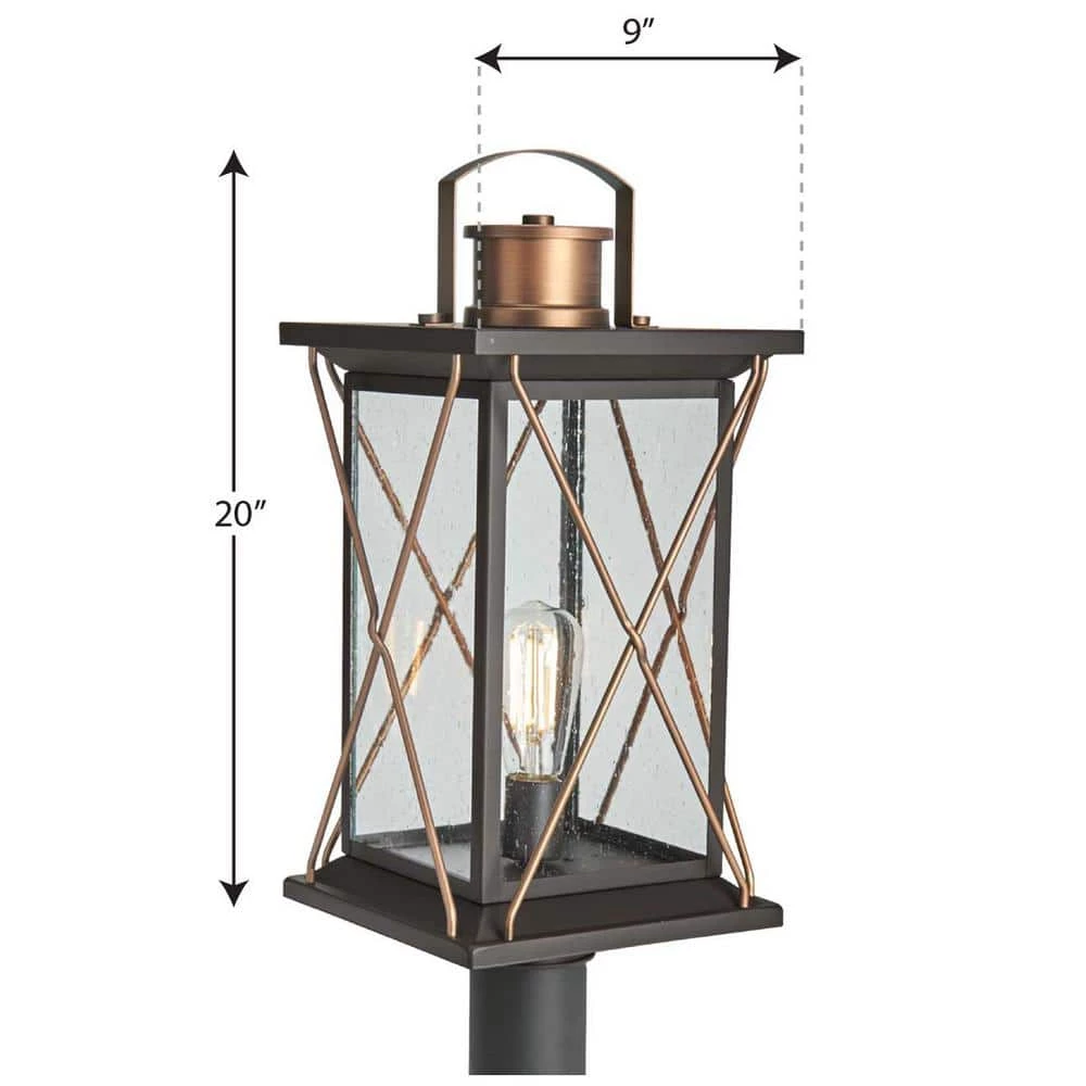 Transform your home into a warm and cozy dream with the friendly farmhouse-style of this post lantern. A rustic X-brace design decorates each side of the charming lantern silhouette. Clear seeded glass panes add an extra pop of rustic personality. An antique bronze finish complemented with antique copper accents adds warmth and character as the lantern infuses your home with gentle illumination.