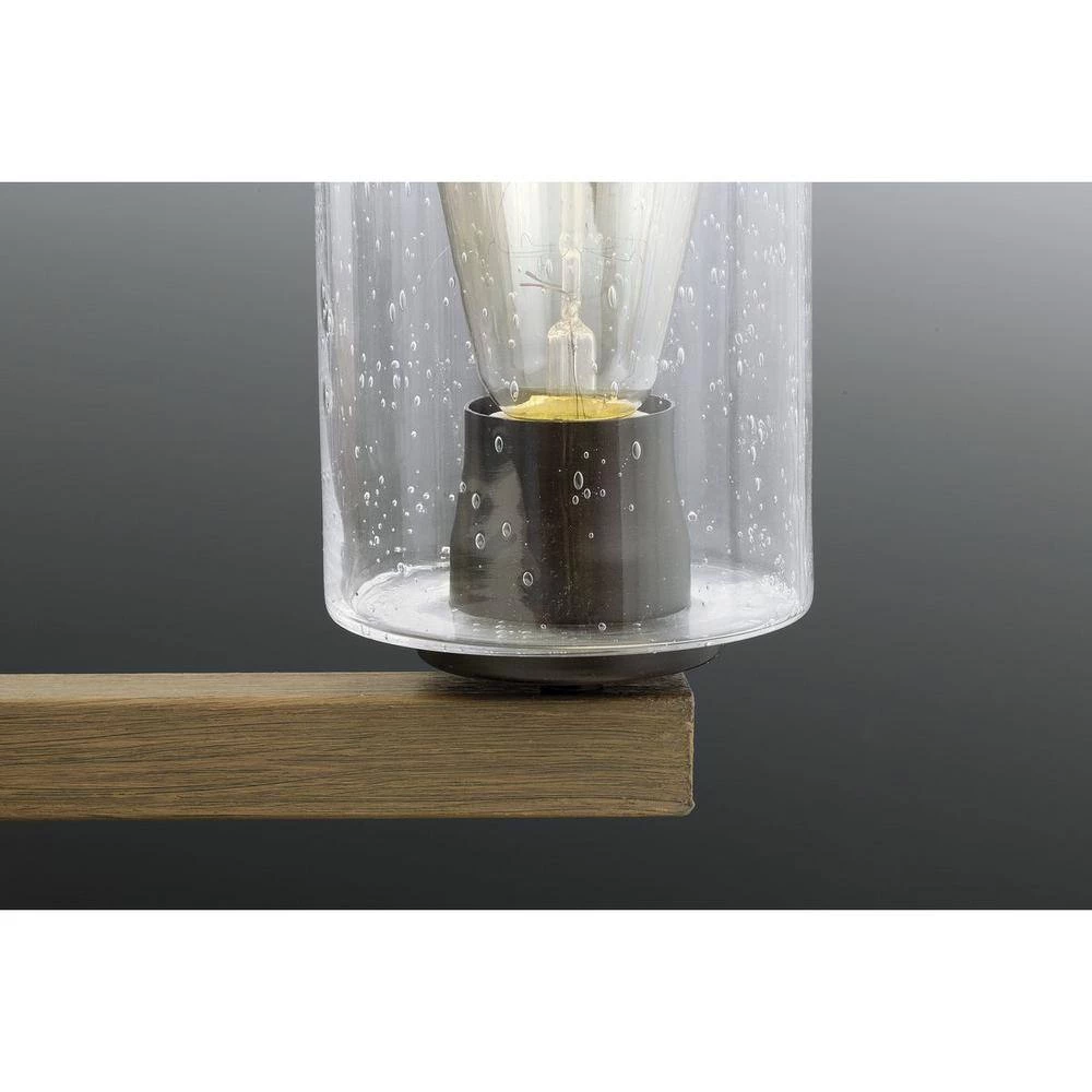 - A faux-painted wooden plank support artful clear, seeded glass shades