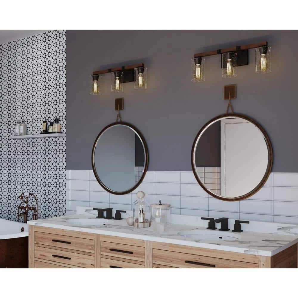 Rustic and vintage decor can transform your home into a nostalgic retreat reminiscent of rural farmhouses. Exposed iron details and a faux-painted wooden plank support artful, clear, seeded glass shades. Combine with vintage-style light bulbs to create a romantic focal point for any room.
