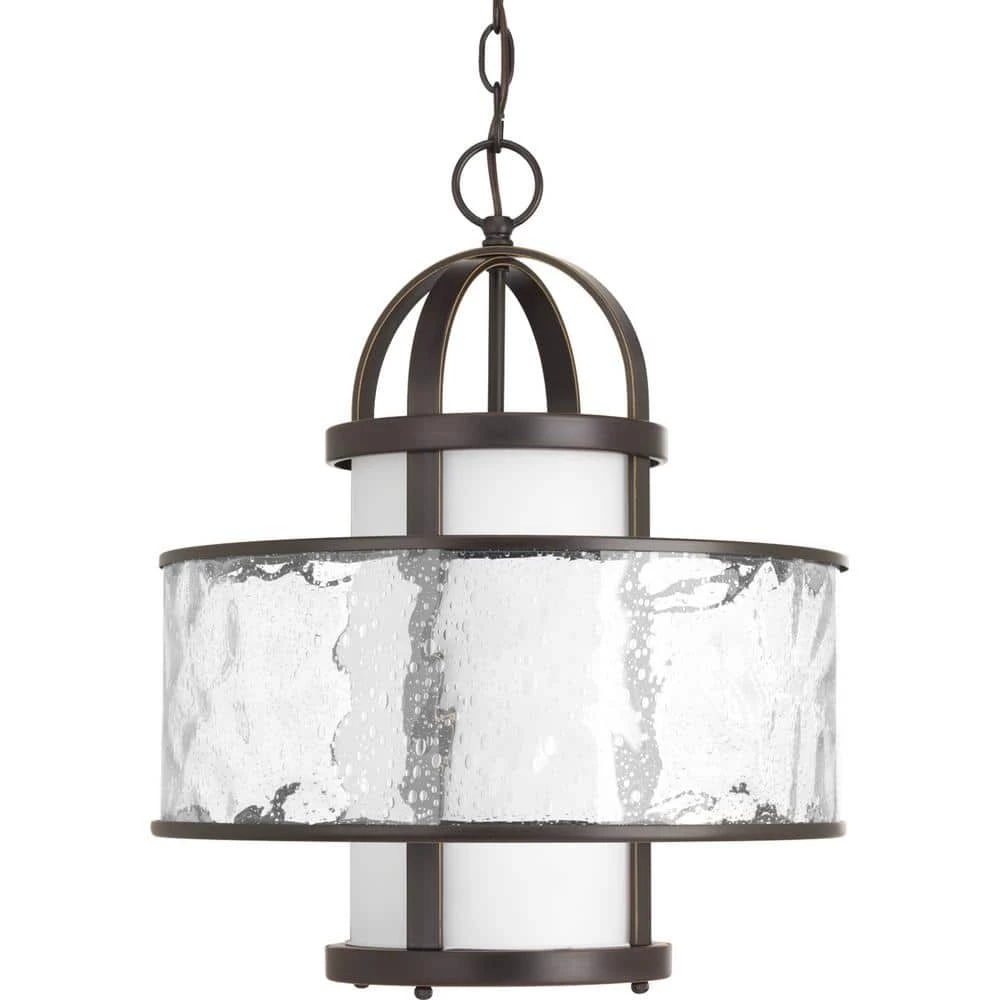 One-light hanging fixture with distressed clear glass and etched opal glass. A contemporary interpretation of antique nautical lanterns. Antique Bronze finish.