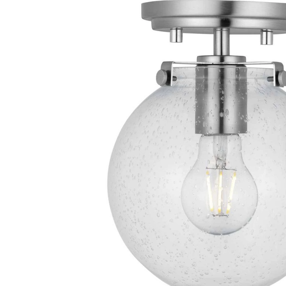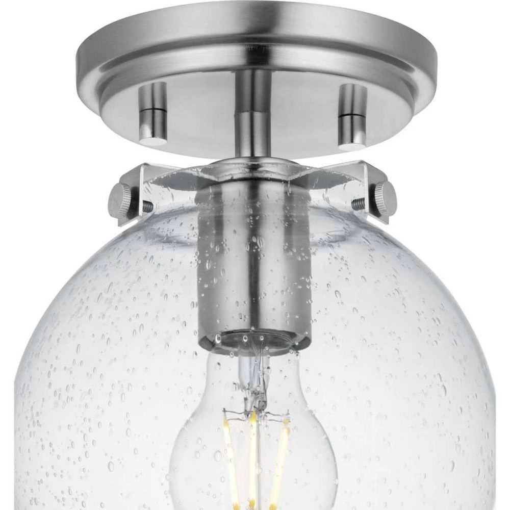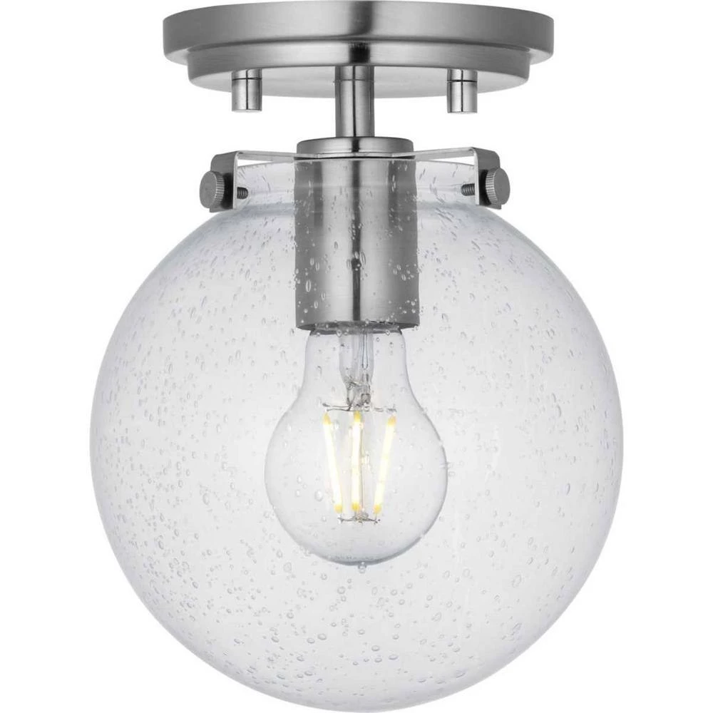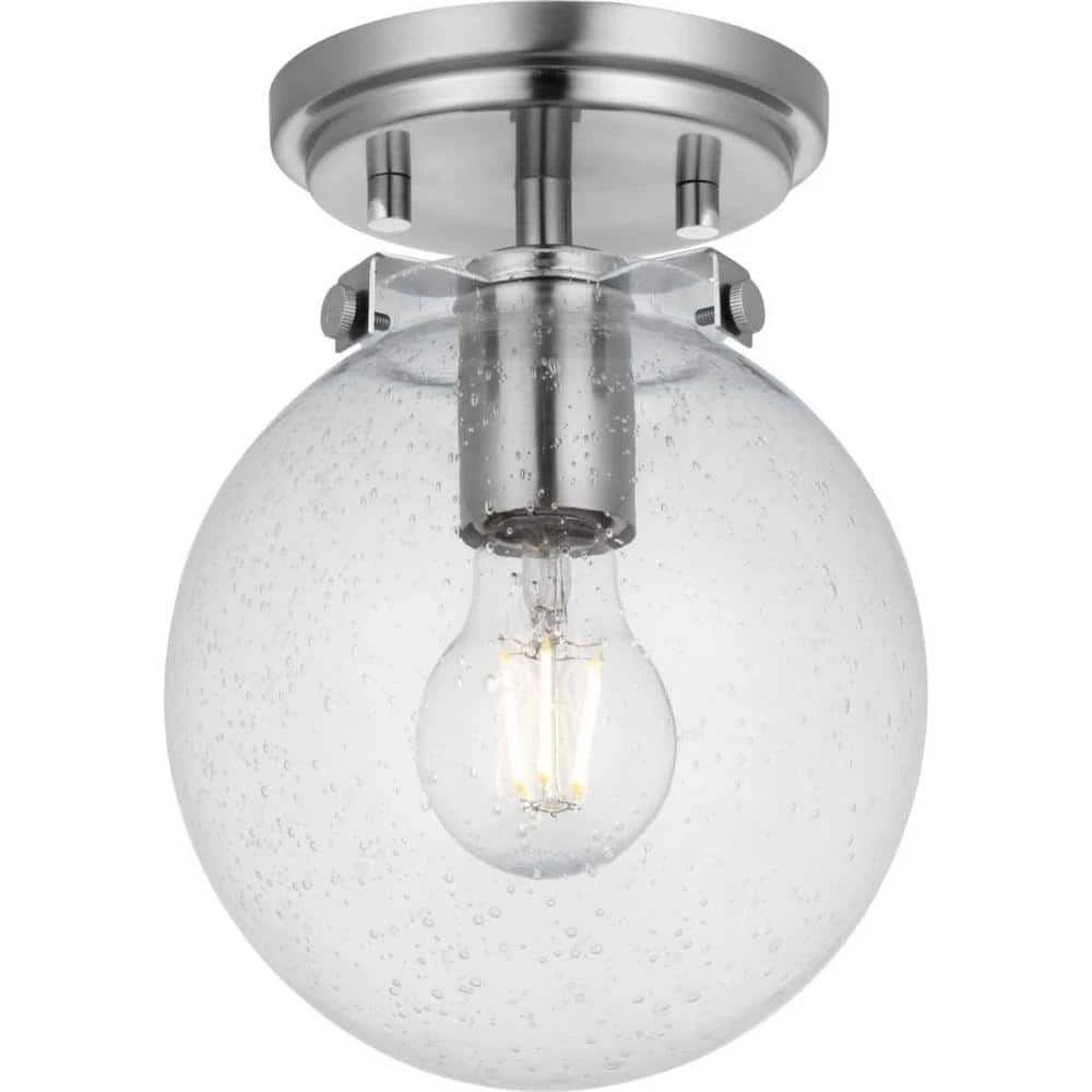 Combine industrial style with contemporary character with the Berea Collection 1-Light Brushed Nickel Semi-Flush Mount Light. A light source glows from inside a seeded glass globe shade for extra visual interest. A sleek light base and circular ceiling plate are coated in a beautiful brushed nickel finish that accentuates the industrial aesthetic of the light fixture.