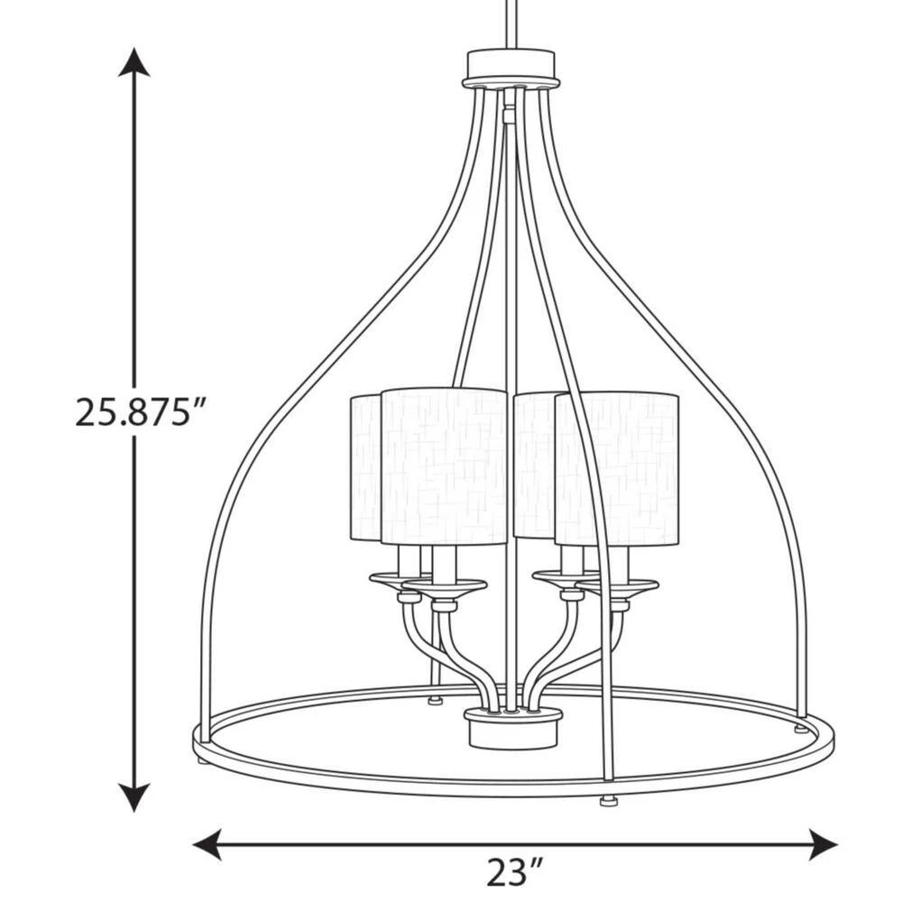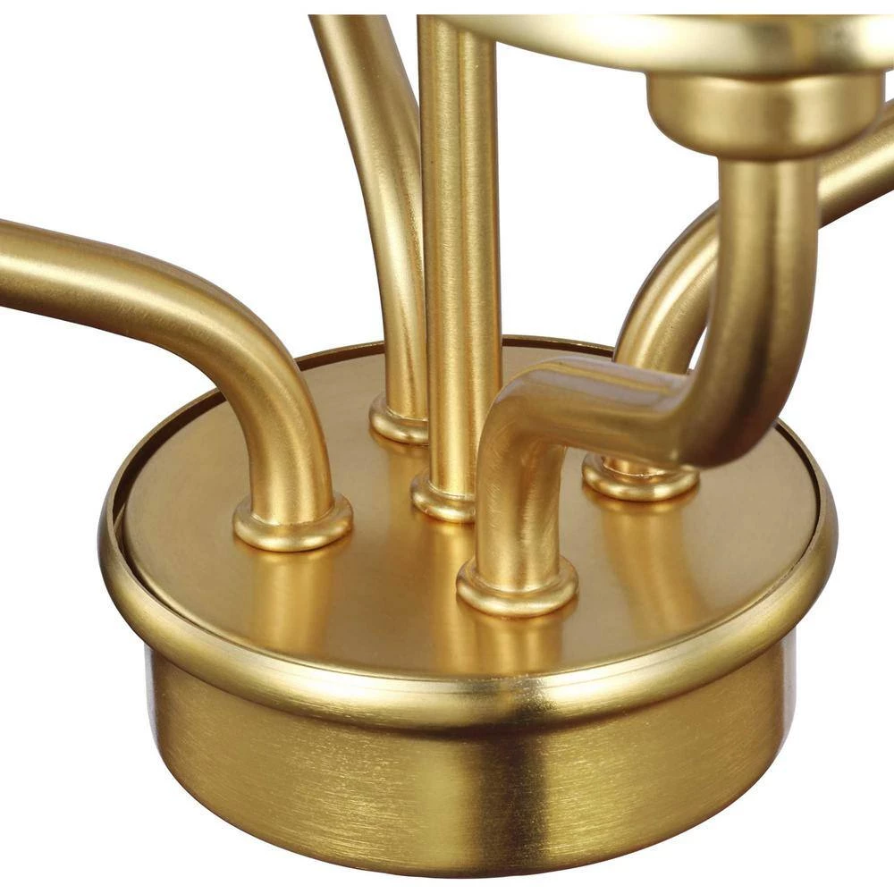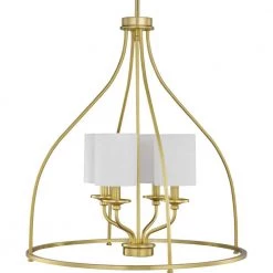 Inspired at its roots by an understated beauty and a breathtaking formal elegance, the Bonita Collection Four-Light Satin Brass Foyer Chandelier will make a stunning addition to any luxurious living space. A magnificent golden cage embraces the drum shades in a teardrop fashion with four stain brass arms flowing down from an ornamental circular plate near the top of the design. The shades are held in place by golden candlestick light bases supported by elegantly curved arms.
