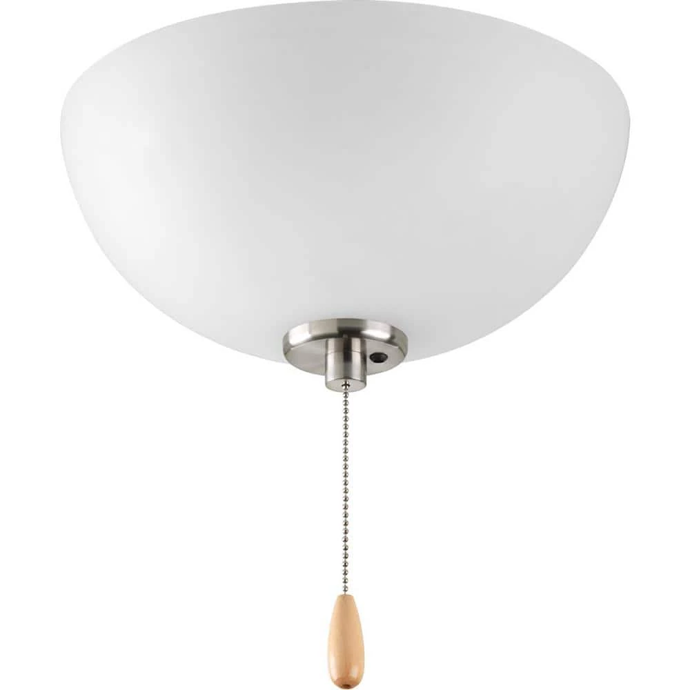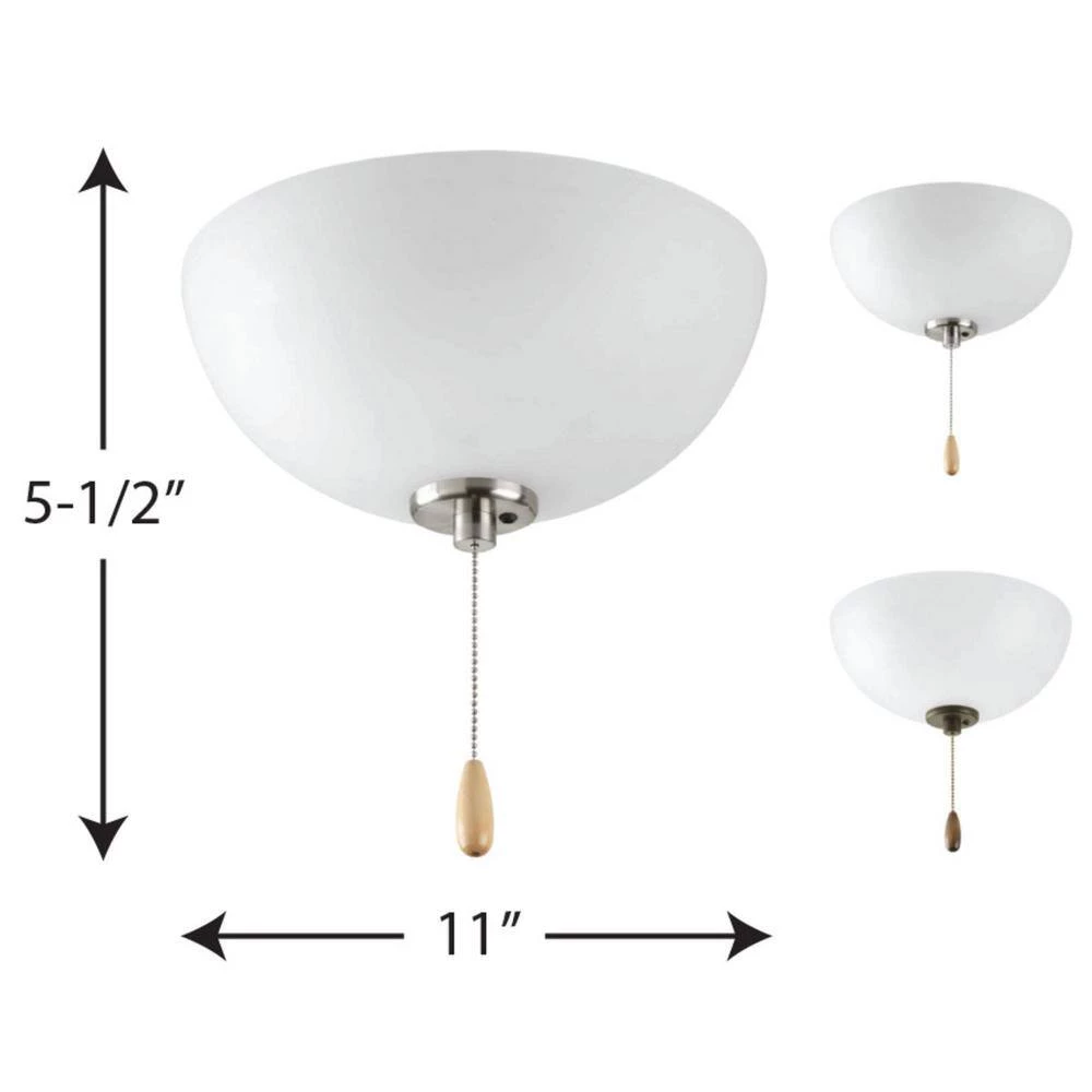 Two-light bowl fan kit with smooth white etched glass. Finials included are -09 Brushed Nickel and-20 Antique Bronz. Coordinates with Gather, Joy, Bravo and many other collections. Convenient universal styling on any Progress fan comes with quick-connect wiring. Includes two 3000K, 800 lumen each (source), Title 24 certified LED bulbs.