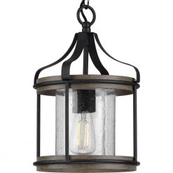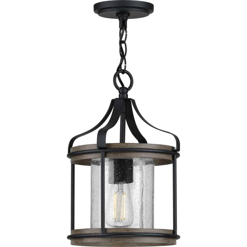 The Brenham Collection 1-Light Black Mini-Pendant offers a true farmhouse feel with its mixed-elements design. Hand-painted weathered gray faux wood accent rings bookend the top and bottom of the light fixture. black metal frame with simple metal bars and ribbon-like metal arms reach down from a central metal link chain. The frame holds a clear seeded glass shade in place that adds extra visual character.