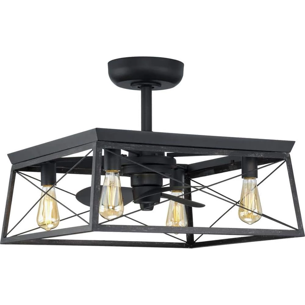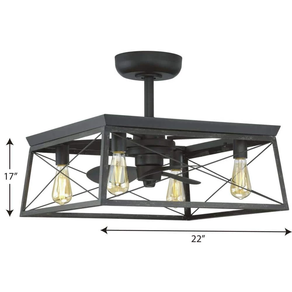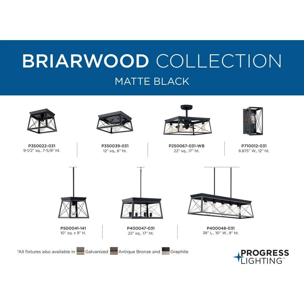 Create a cozy and comfortable home atmosphere with the Briarwood Collection 22 in. 3-Blade Matte Black AC Motor Farmhouse Ceiling Fan ideal for any great room, bedroom, living room or bonus room. Perfect for farmhouse, rustic and coastal style settings. 3 blades coated with a matte black finish rotate within the cerused black open-frame design that boasts a classic cross-brace pattern. Measures 22 in. Dia x 17 in. H. A 1 in. x 6 in. downrod is included. Longer accessory downrods can be ordered separately A 3-speed remote control with batteries is included so you can adjust full-range dimming and fan speed without breaking a sweat. Dual mount canopy that accommodates flat or sloped ceilings (sloped minus 22°). Includes 4 medium base vintage bulbs, each 5.5-Watt LED, 2200 color temp, 500 Lumens, 80CRI, dimmable. Experience energy-efficient savings with the fan’s cutting-edge AC motor. Certifications: Title 20, cETLus and damp Location Listed. Pairs with additional fixtures from the Briarwood Collection by Progress Lighting. Our Limited Lifetime Warranty ensures your complete satisfaction with your purchase and we offer professional after-sales customer service support. It’s time to breathe new life into the mundane every day with timeless and truly transformative lighting. Make your purchase today to begin your journey to a whole new lighting experience. Progress Lighting products are designed for exceptional quality, reliability and functionality.
