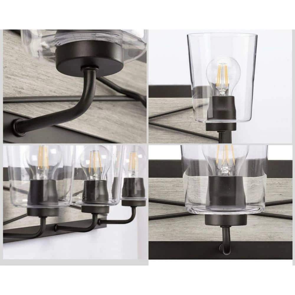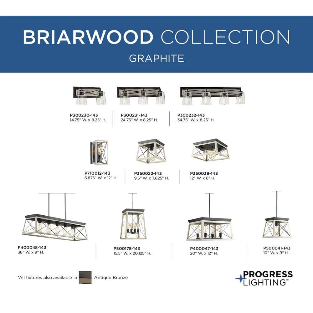 With a nod to its farmhouse roots, the Briarwood 3-light bath offers a triad clear glass shades attached to a Graphite-finished backplate. The X-brace design takes center stage atop an oak-painted, faux wood, rectangular shape, giving the fixture a back country feels making it a suitable choice for bathrooms and hallways in rustic and farmhouse settings. Compliment your room with this stylish fixture.