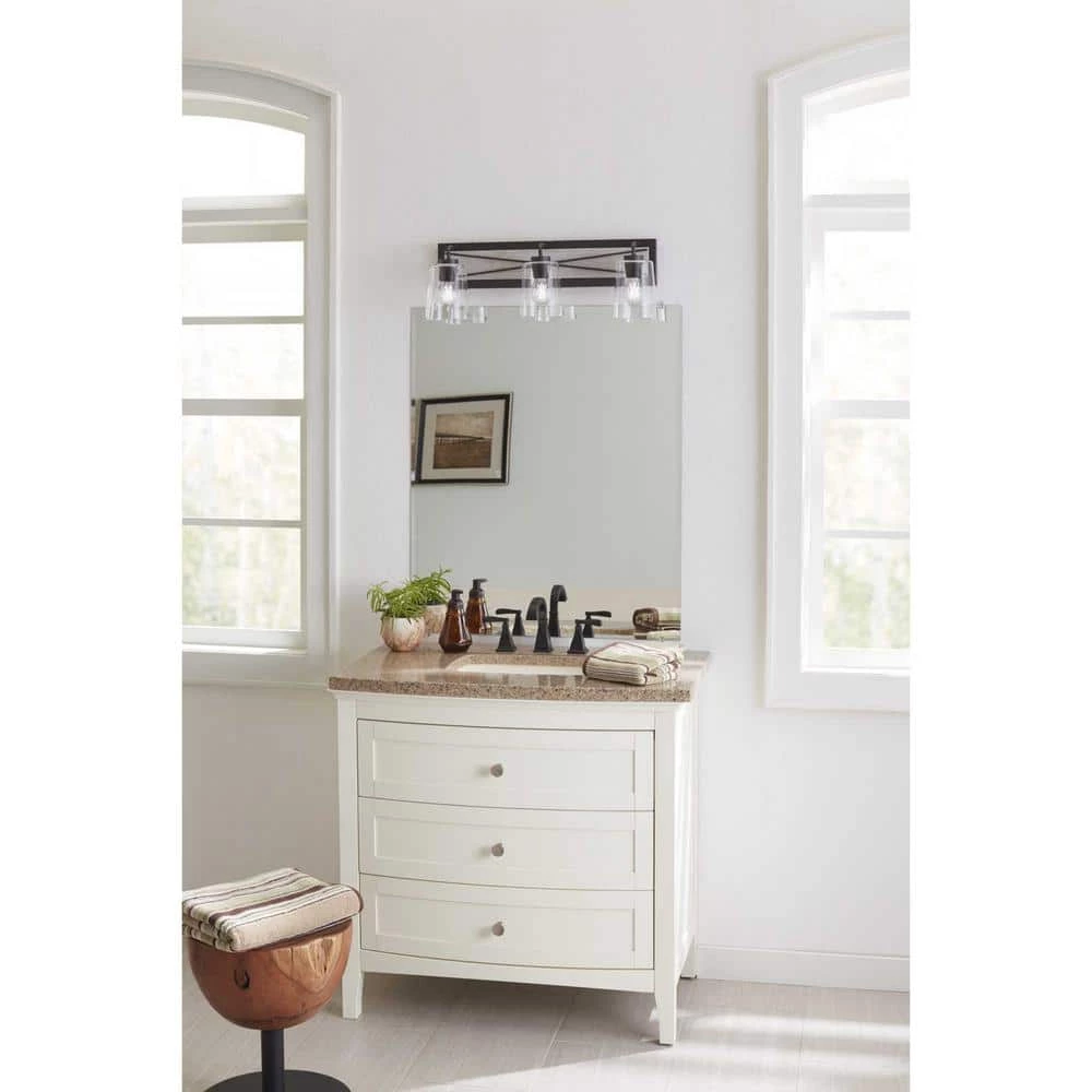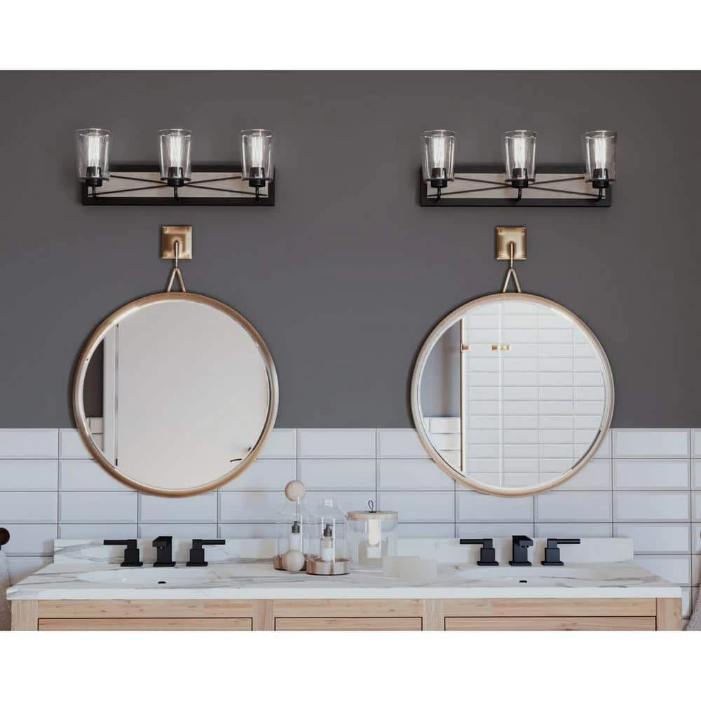 - 3-light bath vanity features a classic X-brace pattern as seen on barn or farmhouse doors and gates