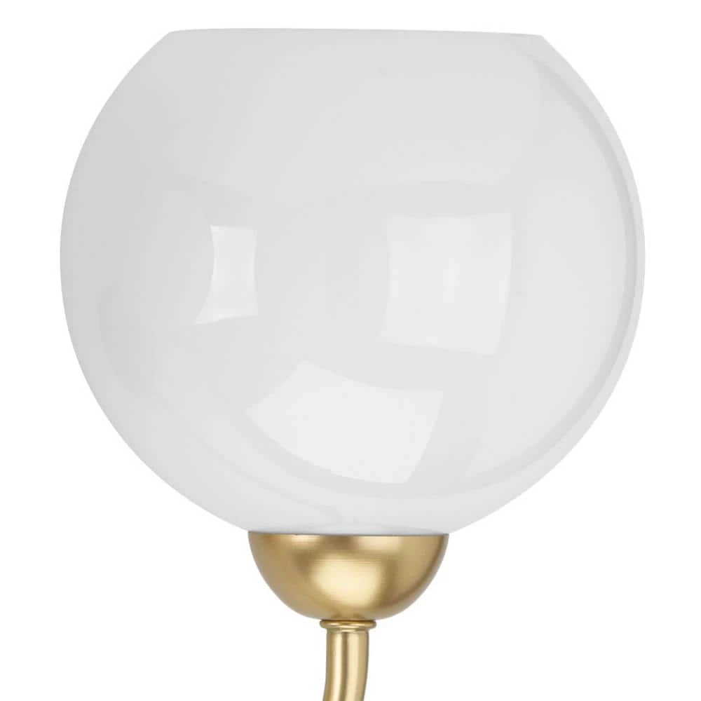 - Metallic finish supports glossy white glass globes to create a timeless modern design
