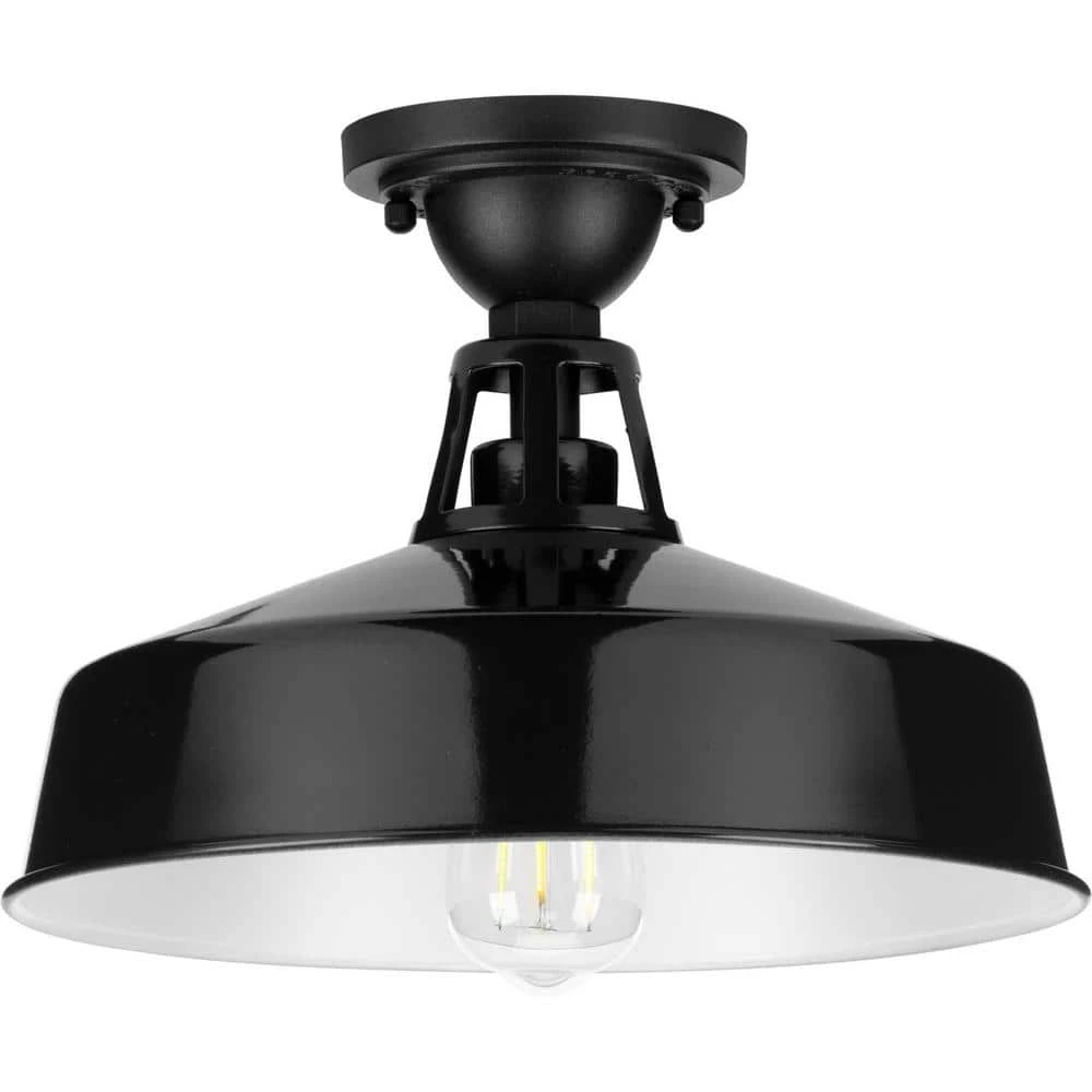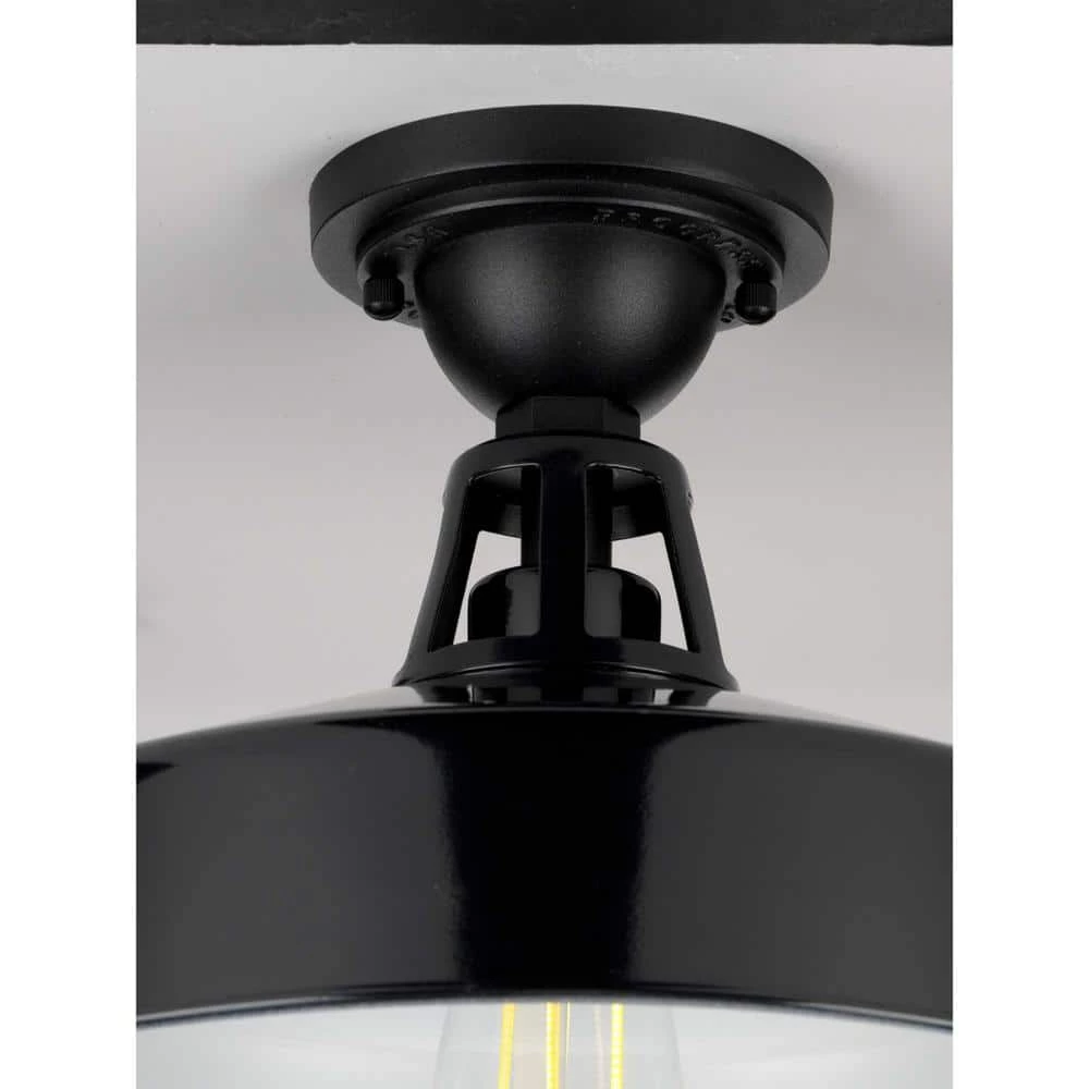 - An industrial-style ceiling plate anchors the light fixture in place and adds a touch of urban flair