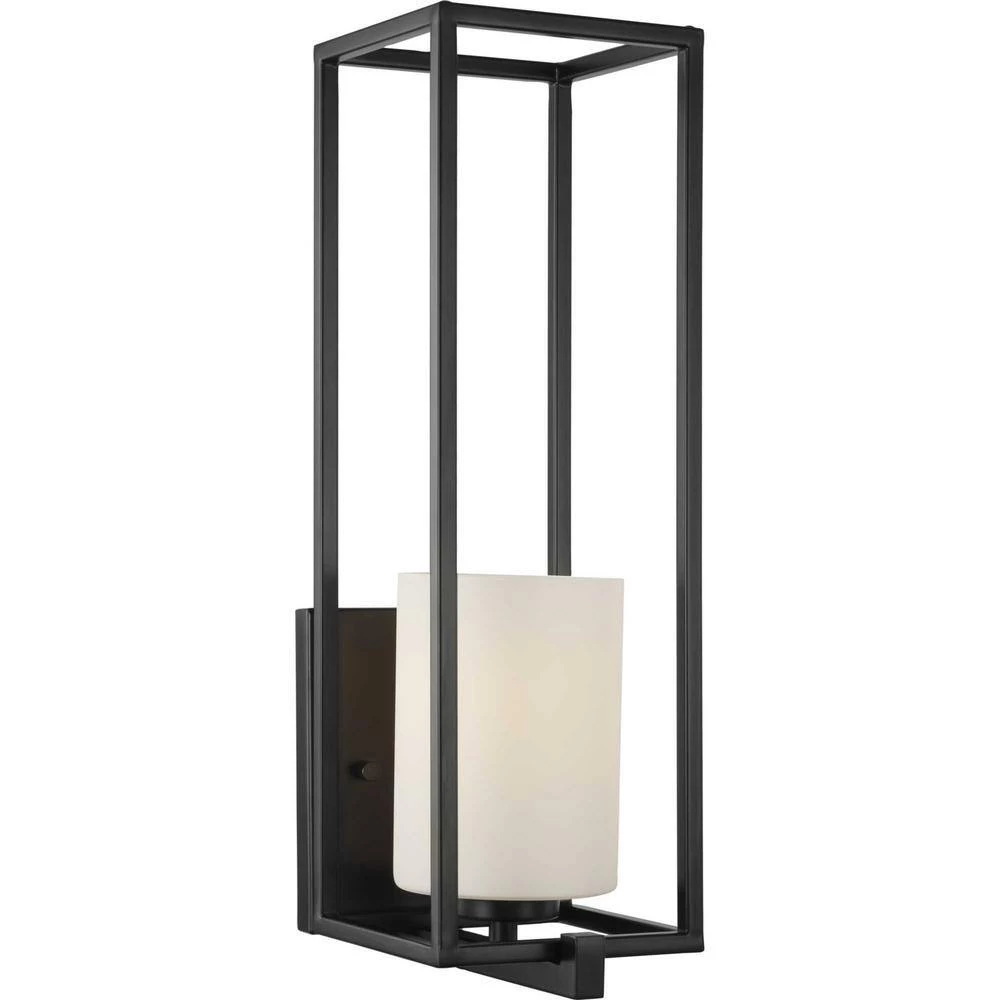 Stick with simple geometric forms and clean crisp lines with this modern wall bracket. A beautiful opal glass shade visually calms the sharp edges of the boxy frame in a masterful stroke of design excellence. The frame is coated in a classic black finish that contrasts the light shade. The light fixture is just right for spaces in need of a subtle, feminine touch.