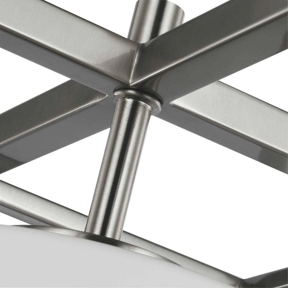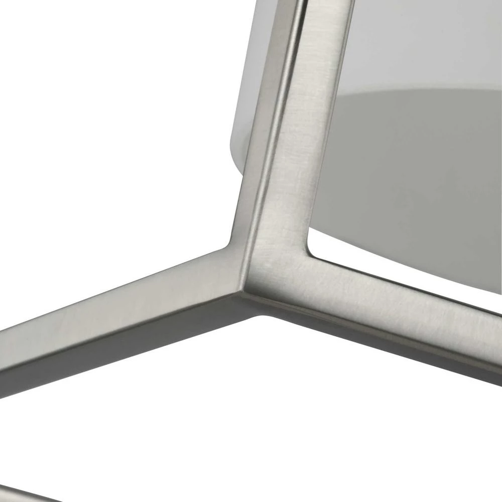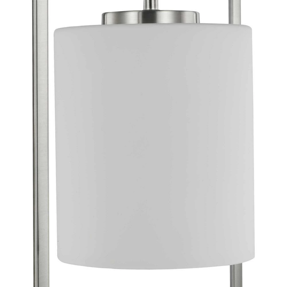 - Frame is coated in a classic brushed nickel finish that contrasts the light shade
