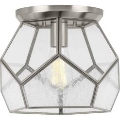Inspired by modern geometric designs and contrasting elements, this bohemian-style flush mount is an attention-grabber for all the right reasons. Geometric shapes form from the brushed nickel frame. Glass panels create a shade that holds an industrial light base inside.
