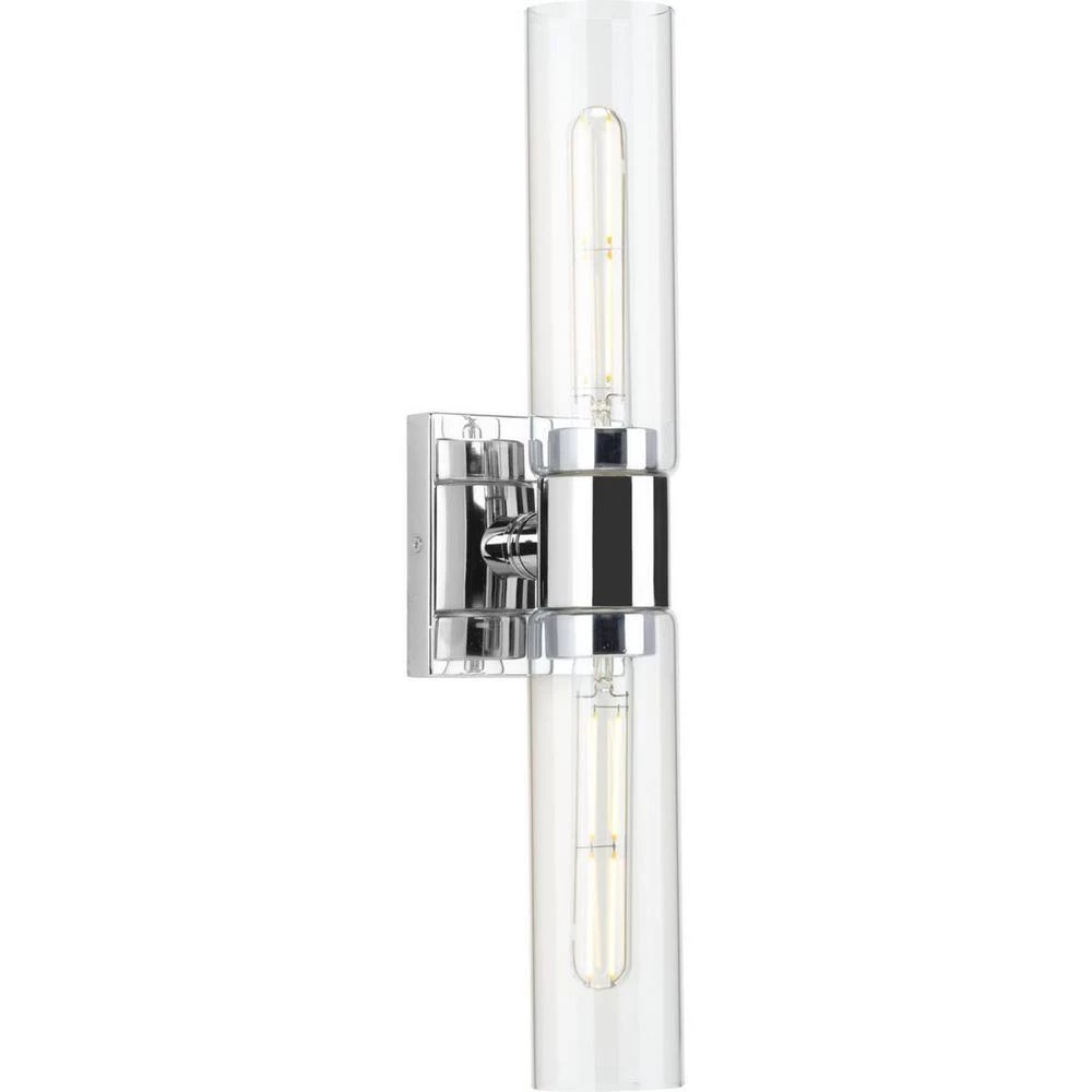Embrace minimalist simplicity with the Clarion Collection 2-Light Polished Chrome Glass Modern Bath Vanity Light. The square backplate and rounded light base are coated in a crisp polished chrome finish for a modern aesthetic. Light sources glow from inside cylindrical shades for a crisp, clean look. for ideal illumination, use 2 medium base T-lamp bulbs that are sold separately (60-Watt maximum – LED/CFL/incandescent). The wall light is compatible with dimmable bulbs. The bath light’s sleek design is ideal for any entryway, hallway, foyer, bedroom, sitting room or bathroom in contemporary, modern and transitional style settings. It’s time to breathe new life into the mundane every day with timeless and truly transformative lighting. Make your purchase today to begin your journey to a whole new lighting experience. Progress Lighting products are designed for exceptional quality, reliability and functionality.