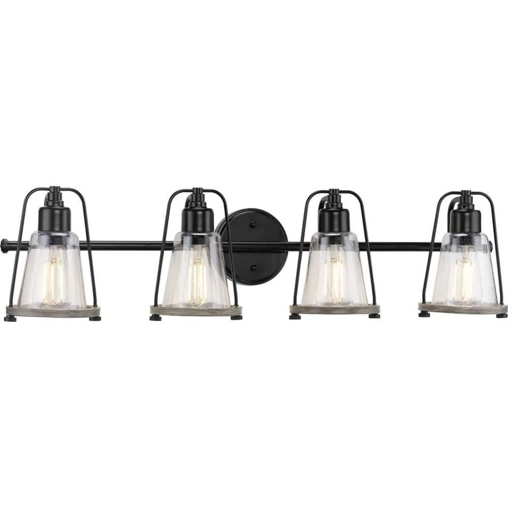 Mix old and new for charming character with the Conway Collection 4-Light Matte Black Clear Seeded Farmhouse Bath Vanity Light. A matte black bell-shaped frame and round backplate are accented by hand-painted, weathered grey wood-style accents for a charming nautical aesthetic. A light source glows from within a clear seeded glass shade for visual texture. for ideal illumination, use 4 medium base bulbs that are sold separately (100-Watt maximum – LED/CFL/incandescent). The bath light is compatible with dimmable bulbs. The bath light’s seaside-inspired design is ideal for any entryway hallway, foyer, bedroom, sitting room, living room or bathroom in farmhouse and coastal style settings. It’s time to breathe new life into the mundane every day with timeless and truly transformative lighting. Make your purchase today to begin your journey to a whole new lighting experience. Progress Lighting products are designed for exceptional quality, reliability and functionality.
