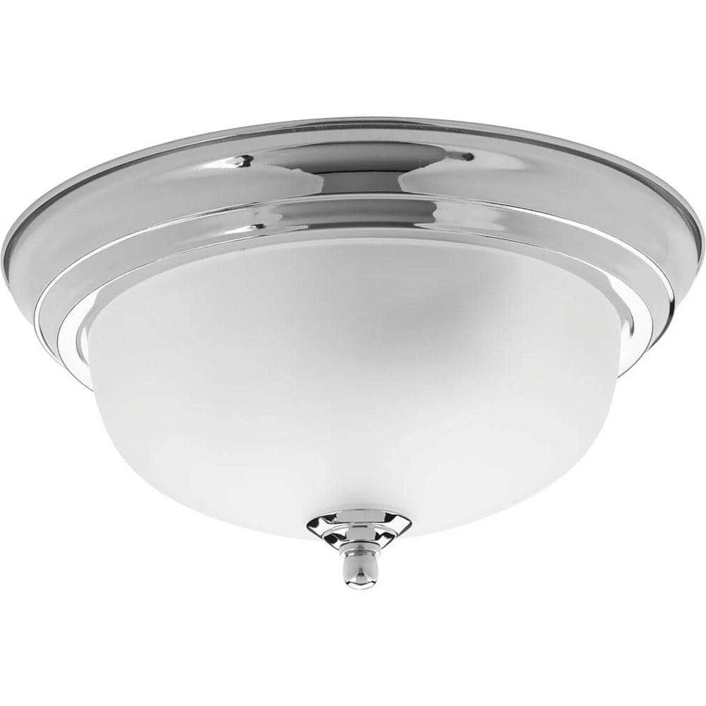 1-light flush mount with dome shaped glass, solid trim and decorative knobs. The polished chrome finish has an etched glass shade. A versatile fixture that can be used in many lighting applications.