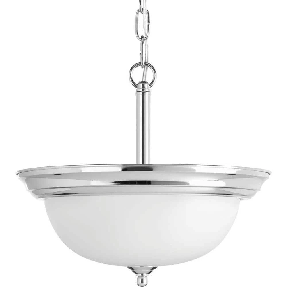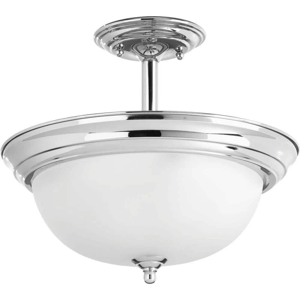 2-light semi-flush/convertible mount with dome shaped glass, solid trim and decorative knobs. The polished chrome finish has an etched glass shade. Chain and ceiling mounts both included. A versatile fixture that can be used in many lighting applications.