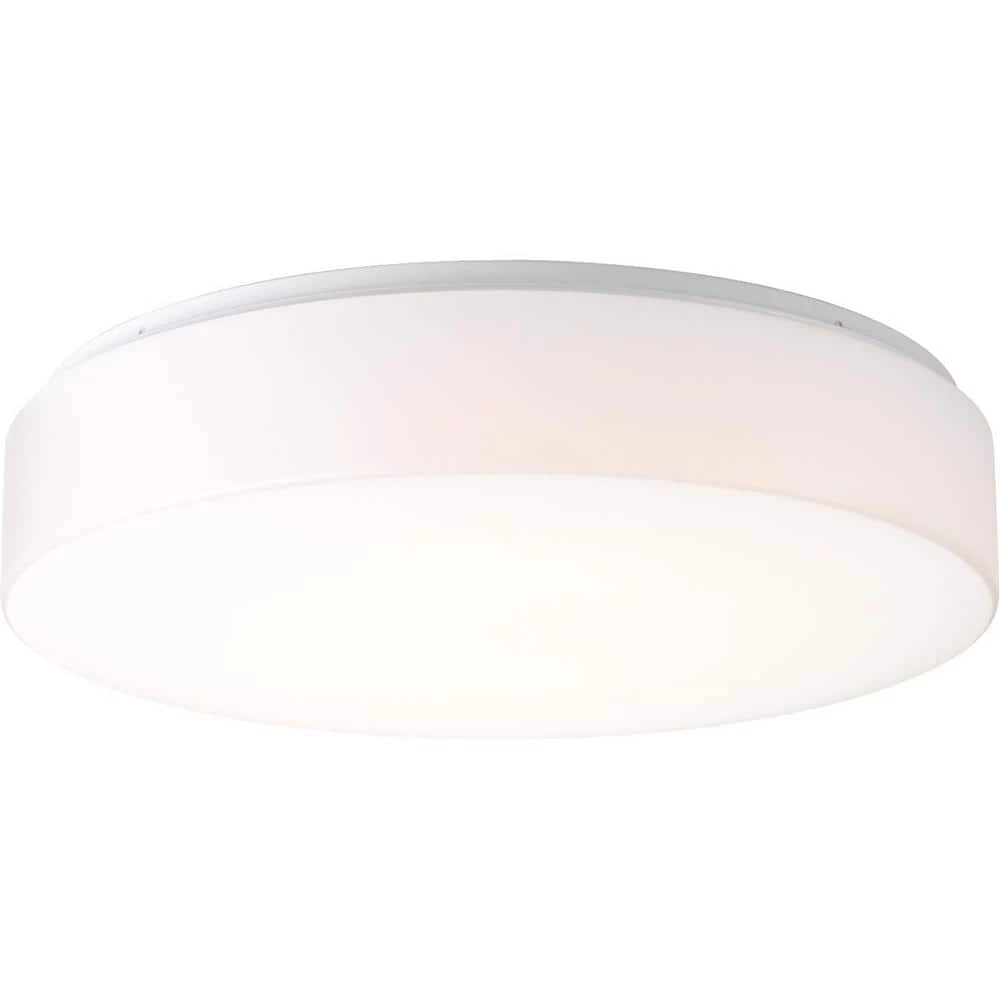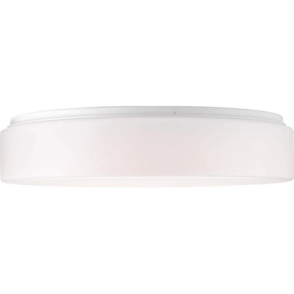LED flush mount with white acrylic diffuser mounts to baked enamel ceiling pan. Twist on installation with a single locking thumb screw. UL approved for damp locations. Ceiling or wall mount. 2520 lumens, 90 lumens/watt, 3000K and 90CRI. ENERGY STAR and Title 24.