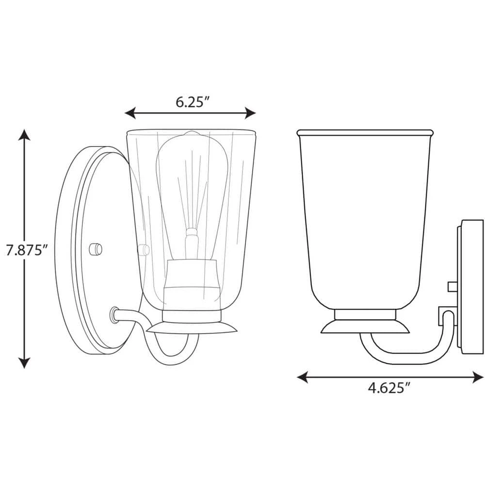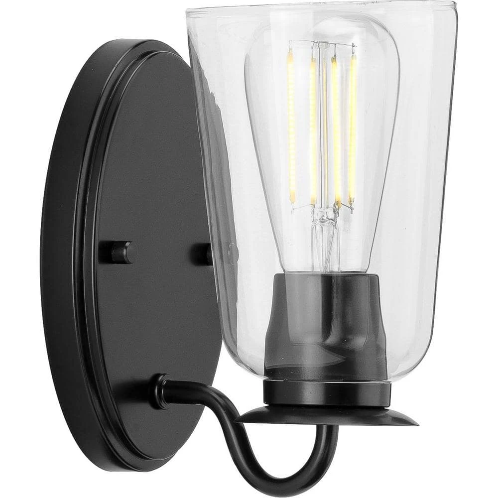 This versatile bath light will find a home in a variety of settings in need of generous illumination. A crisp clear glass shade rests on top of a vintage-style light base. A smooth, curved bar supports the light base and attaches to a black oval backplate.