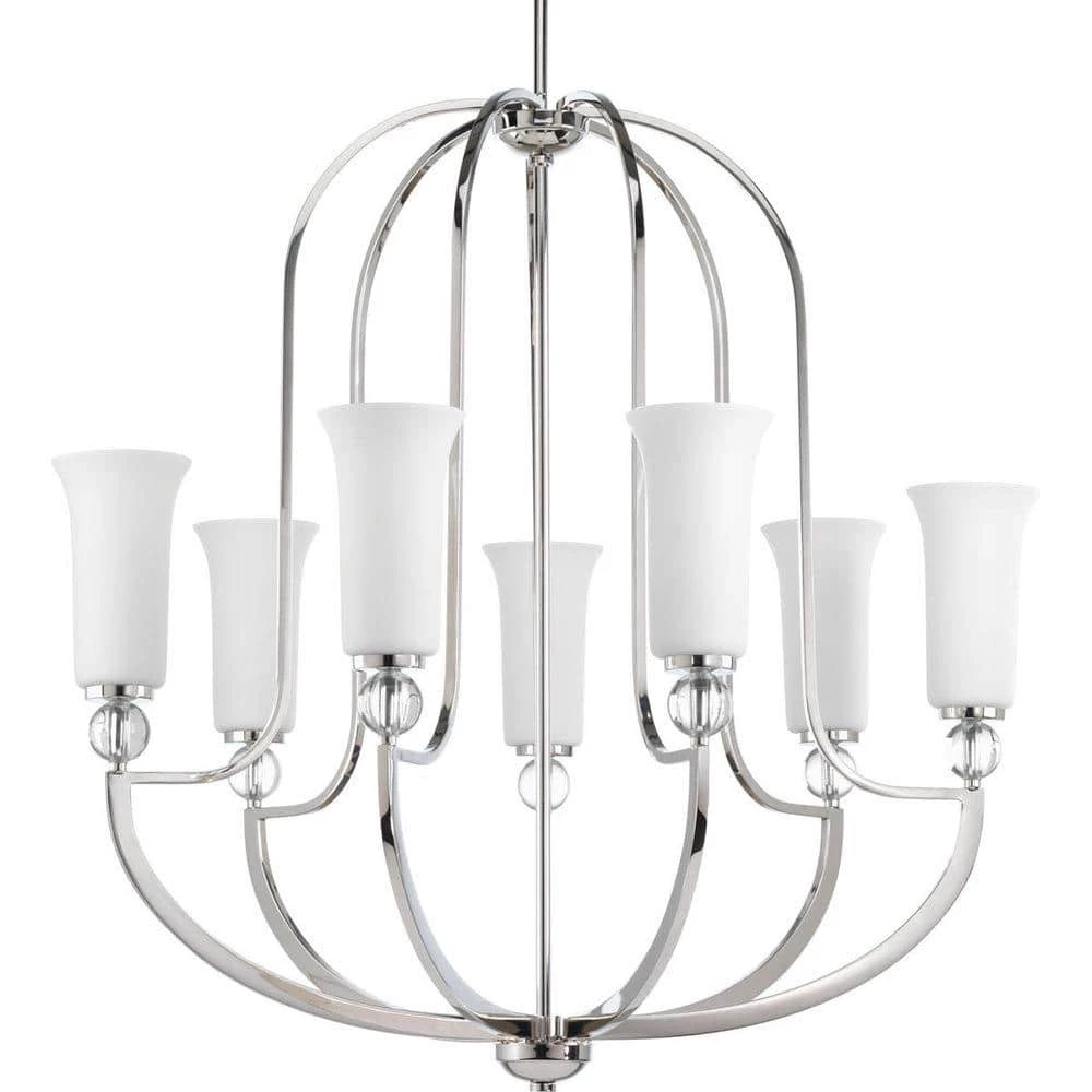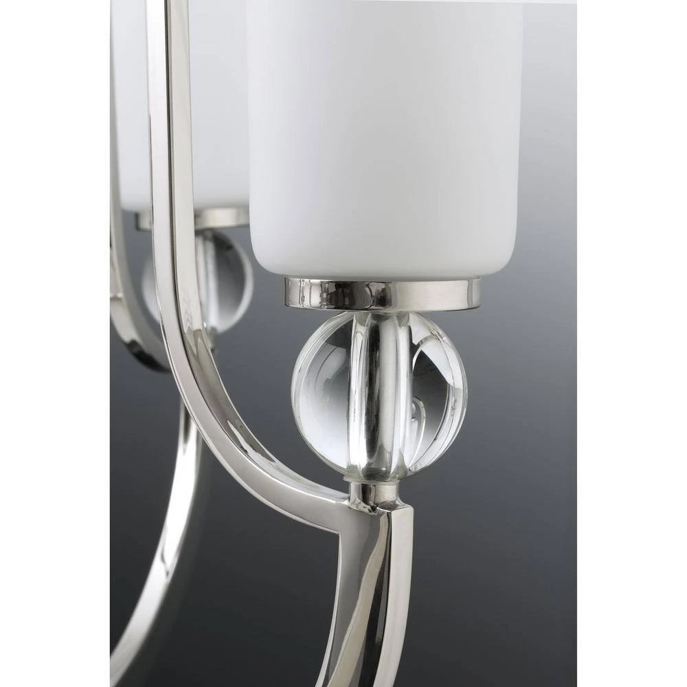 The 7-light chandelier from the Elina Collection spins a traditional classic and modern form by exaggerating its heirloom quality details. The fixture’s tall, trumpeted opal glass, K9 glass orb accents and polished nickel finish create a distinctive silhouette. A beautiful centerpiece for any room decor.