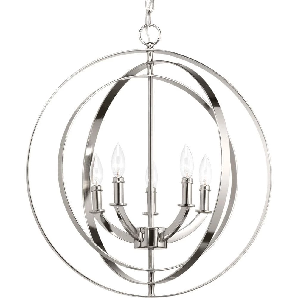 Inspired by ancient astronomy armillary spheres, the interlocking rings pivot for an infinite variety of positions. Five-light chandelier pendant in Polished Chrome is ideal for installations over a farmhouse table, dining room setting or kitchen island. Can be used individually or in groupings of two or more.
