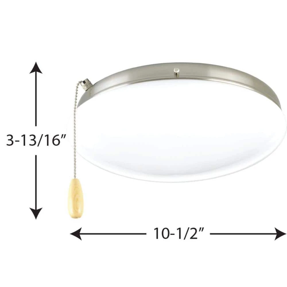 Two-light universal-style ceiling fan light kit in Brushed Nickel features a low-profile, opal glass diffuser that’s ideal for lighting in a bedroom. This fan light kit includes a threaded adapter for quick connection to most indoor ceiling fans that accept an accessory light. Includes two 3000K, 800 lumen, Title 24 certified LED bulbs.
