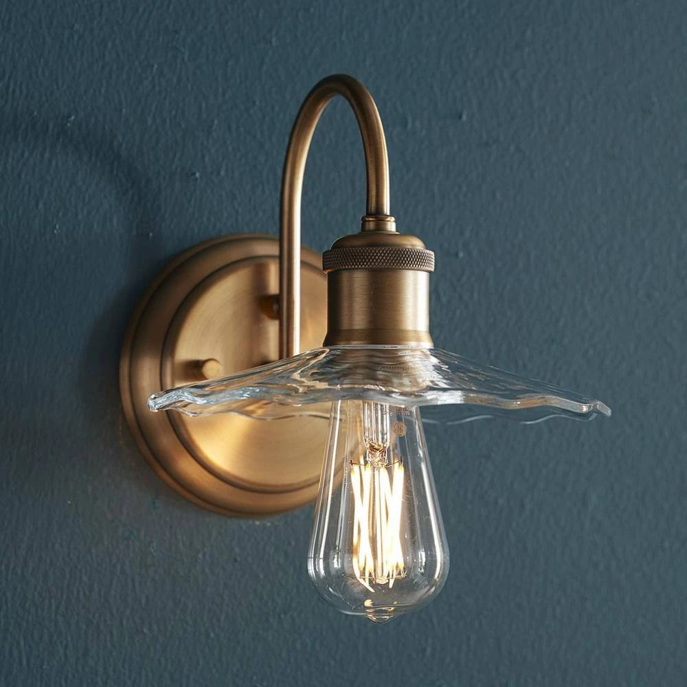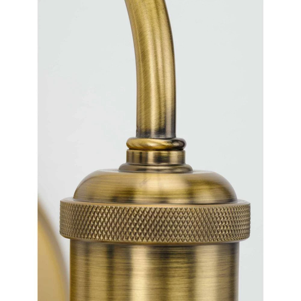 - Simple vintage brass bar attached to a backplate supports a curved arm bending to hold a vintage-style light base