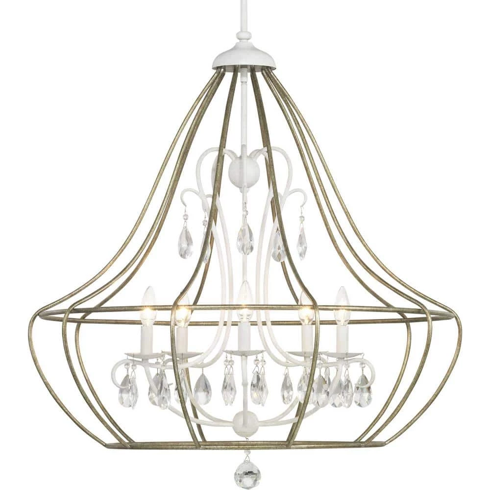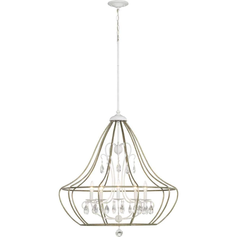 Inspired by the charm of a European countryside, Fleurette is ideal for Farmhouse and Transitional spaces. Its design features a striking juxtaposition of the rustic and the sophisticated. Glass ornaments adorn curved arms that create an elegant interior frame. The five-light chandelier is finished in Cottage White and is embraced by an outer open frame in Gilded Pewter.