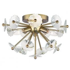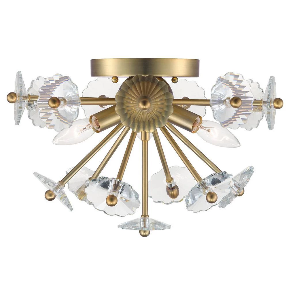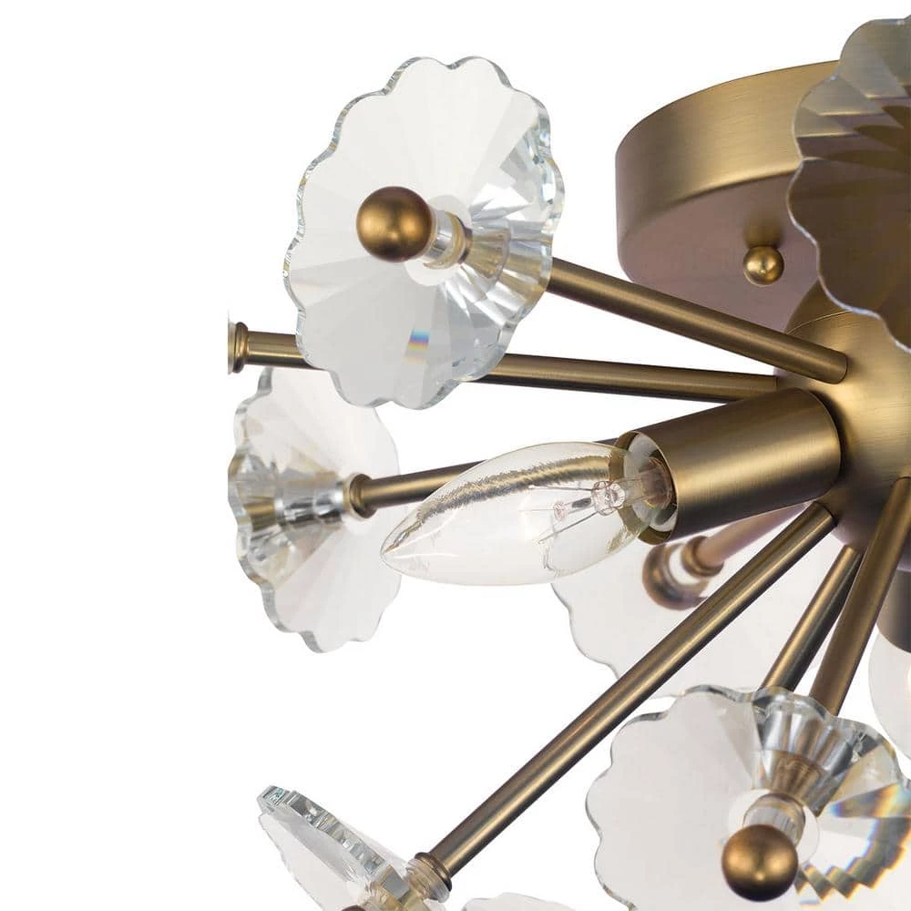 The Floret collections three-light flush mount does more than just provide light it makes a serious design statement. A gorgeous satin brass plate attaches the fixture to the ceiling and support the cluster of smooth, straight arms that bloom from its center. Clear crystal accents adorn the end of the arms, creating a design reminiscent of a white dandelion randy of its seeds to blow away and dance in the wind. This inspiring, one-of-a-kind fixture is ideal for any vintage electric, urban industrial, luxury, or modern interior.